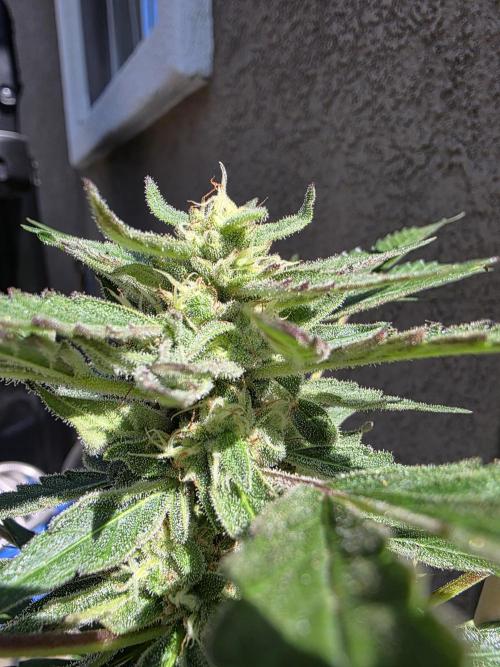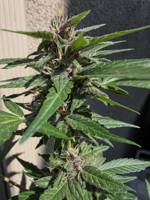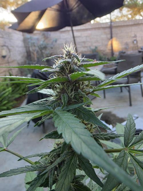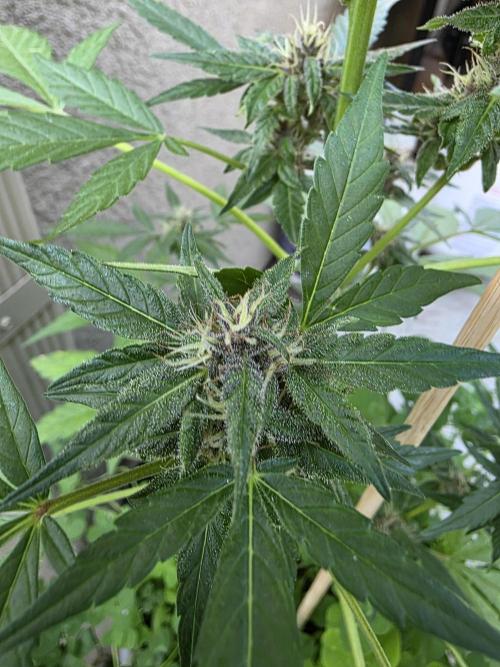 GothBotanical Both outdoor autos settled firmly into early-to-mid flower this week. Nice Cream Auto showed steady bud development with tightly stacking colas and strong lateral structure, holding a healthy green canopy and giving off the first creamy berry aroma. Tiger #2 Auto remained more compact but equally vigorous, pushing dense flower sites and releasing a sweet grape-diesel scent. Trichomes began appearing on sugar leaves across both plants, mostly clear but multiplying daily. The 5-gallon Nice Cream retained moisture longer while Tiger #2 dried faster under afternoon heat, prompting slight watering adjustments. By the end of the week, both plants were thriving under the warm SoCal sun, entering the stacking phase that will define mid-flower in Week 9.