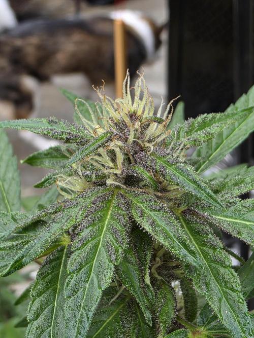 GothBotanical Both outdoor autos hit full mid-flower stride this week, stacking steadily and pushing out stronger aromas with each warm afternoon. Nice Cream continued swelling along every branch, its buds coated in a fresh frost of trichomes and exuding a creamy berry scent with faint rubber notes typical of the strain. The canopy stayed lush and evenly colored with no major fade or stress. Tiger #2 developed a dense, compact structure with heavy pistil coverage and a distinct sweet grape-candy aroma beginning to dominate. The smaller pot required slightly more frequent watering but kept pace in flower production. By the end of the week, trichomes were mostly clear with early cloudiness forming, signaling the start of late-flower swelling as both girls prepared for their final push.