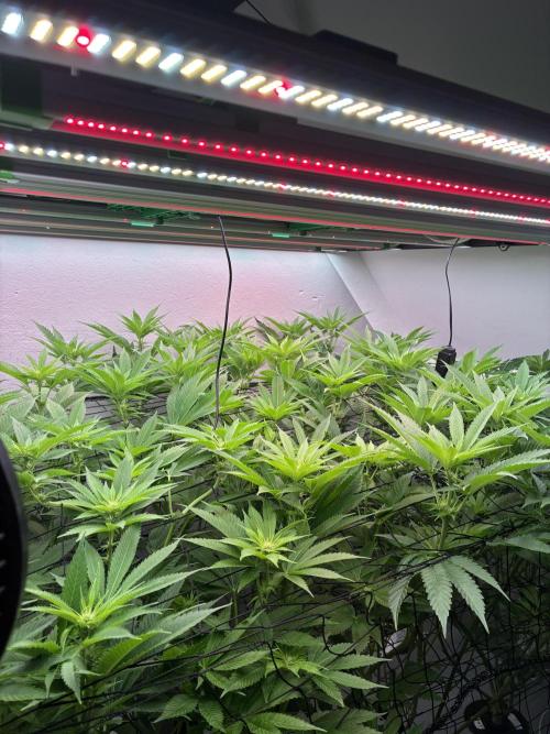HavelGrower Week 7. Did nothing besides putting nutrients und water in the system. Spreaded the plants every 2 days to fill the space. Week 8 will start with 42h of darkness and flip to 12/12 afterwards. From now on I will turn off the far red during lights on period. The canopy is filled so it’s now just beneficial for putting them to sleep or waking them up. Using far red in the early flower time could cause a unwanted stretch. In mid-late flower I am going to use it for the Emerson effect. Conditions of the Grow: 💡 PPFD: 550 umol/m2/s ☀️ DLI: 35.6 mol/day 🌓 Lightcycle: 18/6 h 💨 Humidity: 50-55 % 🌡️ 🌞Daytime Temp.: 21-22 *C 🌡️ 🌙Nighttime Temp.: 18-19 *C 🌡️🌱Leaf Temperature: 20 *C 🌡️💧Water Temperature: 18-19 *C Water TDS: 1000ppm | EC: 2000us/cm 🚰Watersource: Rainwater (TDS: 15ppm | EC: 0.03 us/cm Vegetation Equipment: 🔦 Lamp: Mars Hydro FC-E6500 📤Container: 3x DIY 63L Euro-Box with lid Pot: Netpot 2 inch 💦Pump: M.R.S. Ultimate Whisper Powerpump 22 bar 🚿Nozzles: 12x 0.3mm 🫧Waterfilter: 150 microns 🌬️Fan: 3x Clipfan 🌪️Duct-Fan: AC Infinity 200 mm with Controller and Carbon Filter 🍶Nutrient Brand: Terra Aquatica 🔬Sensors: Waterstation (EC, TDS, Temp, PH, Salt), CO2, Air Temp. & Humidity (VPD), Temperature-Sensor Root Container