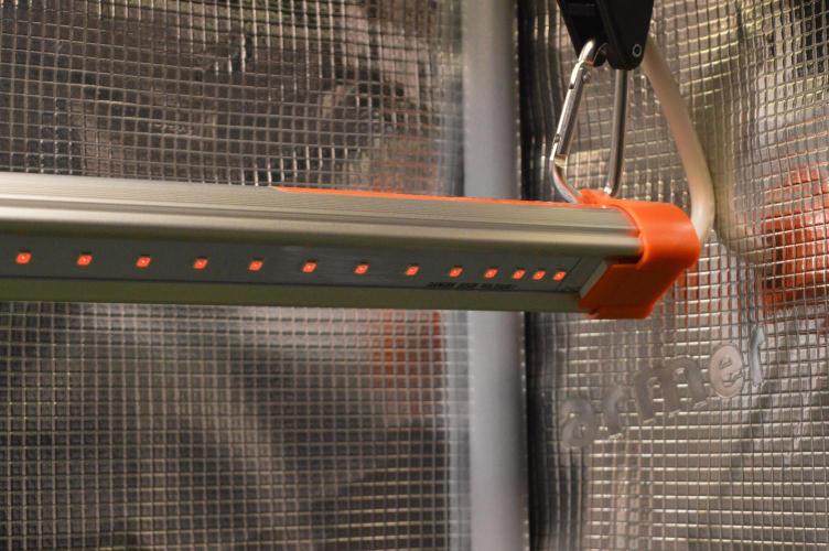 Eine Far Red Lichtleiste im 730-745nm Bereich - die Spider Farmer SUPP-IR 16. Diese schaltet sich 13min bevor die Sanlight angeht ein und geht 2min nach Beginn der Hauptbeleuchtung aus und simuliert so den Sonnenaufgang. Dann schaltet sich die FarRed wieder als kleine Einschlafhilfe für 15min bevor die Sanlight ausgeht ein und läuft für 15min nachdem die Sanlight ausgeht weiter und simuliert somit den Sonnenuntergang. Durch die Beleuchtung mit FarRed LEDs wird die Stoffwechselumstellung nach dem das Licht ausgeht beschleunigt. Damit können sich die Ladys besser in der Nacht erholen und wieder gestärkt in den neuen Tag starten.