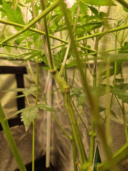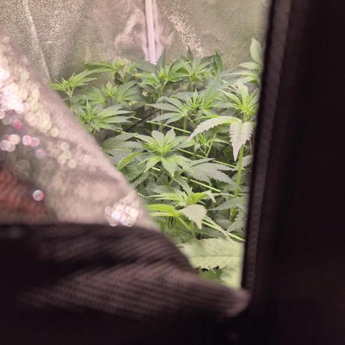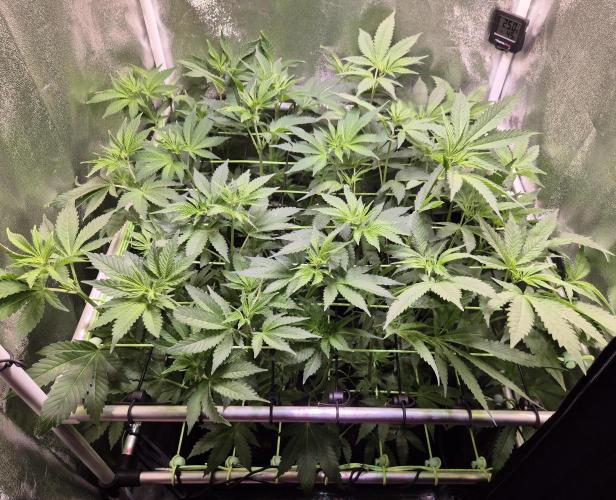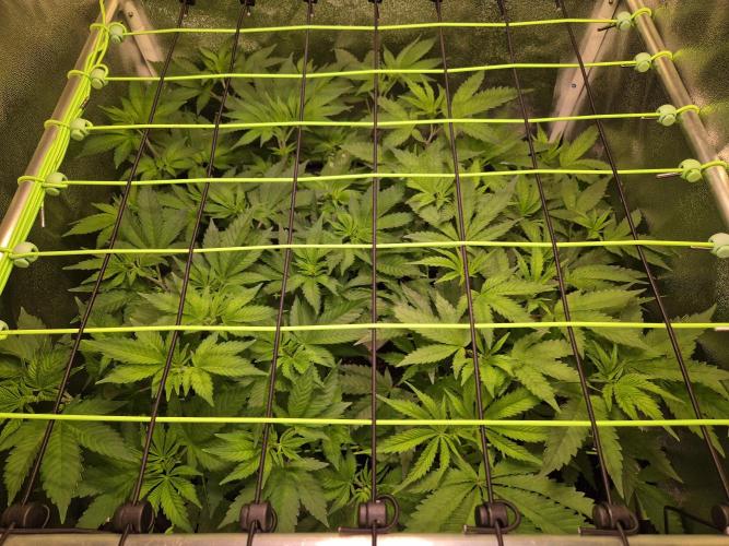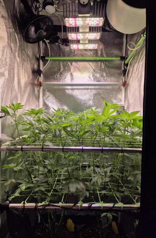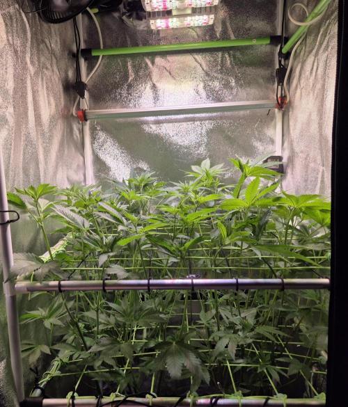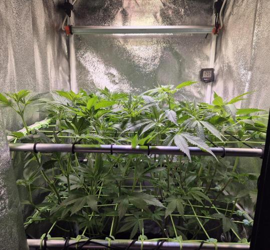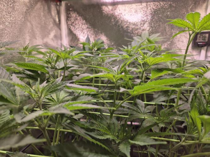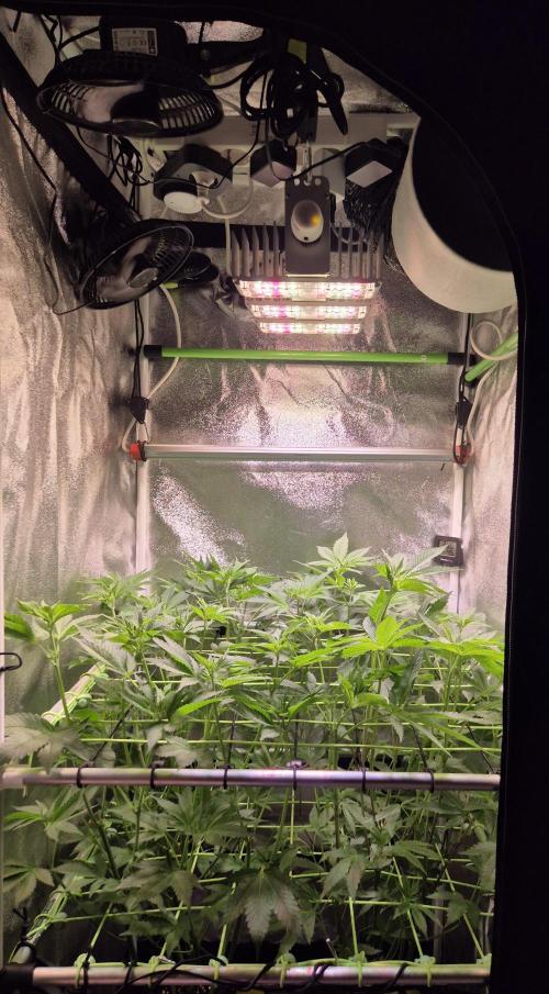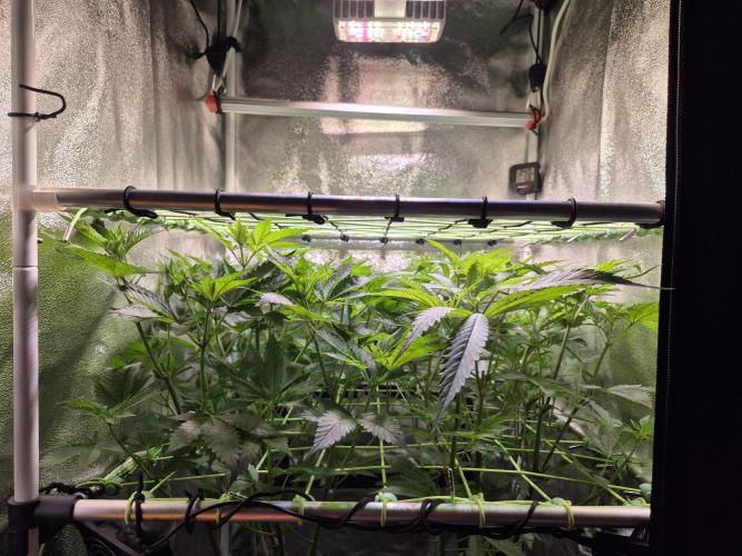 Anfang der Woche wurden die großen Blätter entfernt damit die unteren Triebe an etwas mehr Licht kommen. An Tag27 wurde das Scrog-Netz installiert. Dabei sind leider zwei kleine Unfälle geschehe. Zu einem ist einer der beiden Haupttriebe der WCxBBC bei durchführen unterm Netz durch etwas grobmotorischem banding am Trieb leider abgebrochen. Er wurde mit Bindedraht an der Bruchstelle befestigt. Mal schauen ob der wieder wird. Wenn der Trieb in ein paar Tagen "müde" erscheint, wird er kurz unter der Bruchstelle sauber abgeschnitten. Ansonsten entwickeln sich beide Ladys großartig. Besonders begeistert bin ich von der Lemonite, die Entwicklung der kleinen Nebentriebe der Seitentriebe ist rasant. Bei der bräuchte es nur ein topping und dann 2-3 Wochen bis man die Lemonite mit einem schönen gleichmäßige Canopy und vielen Trieben in die Blüte schicken.