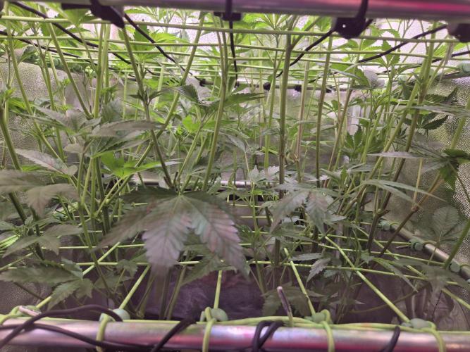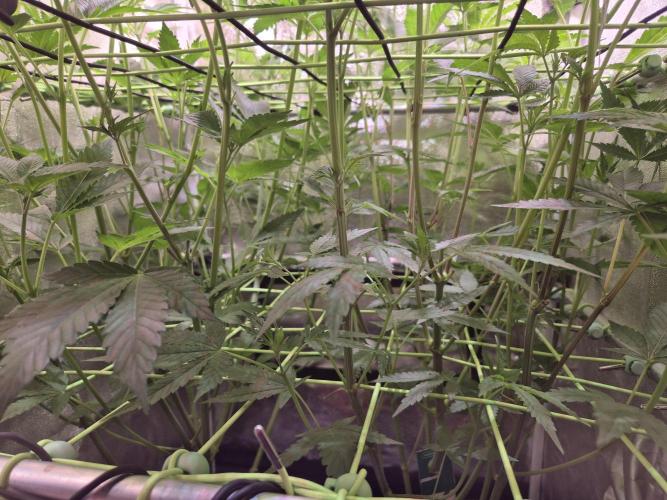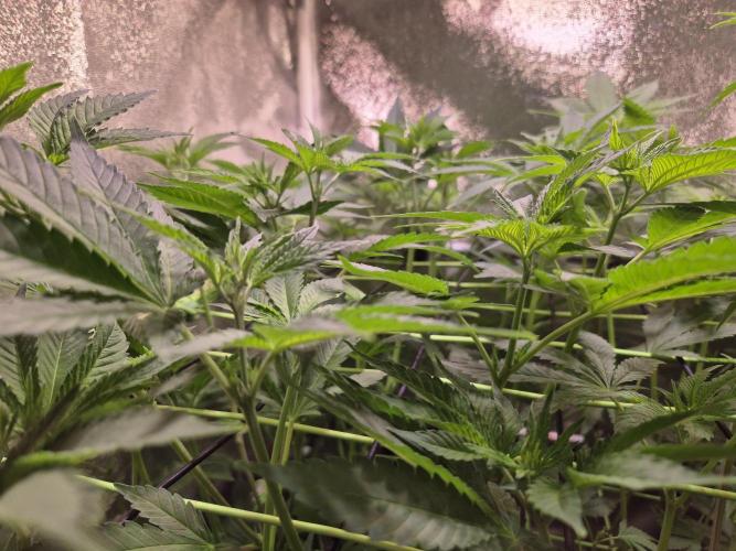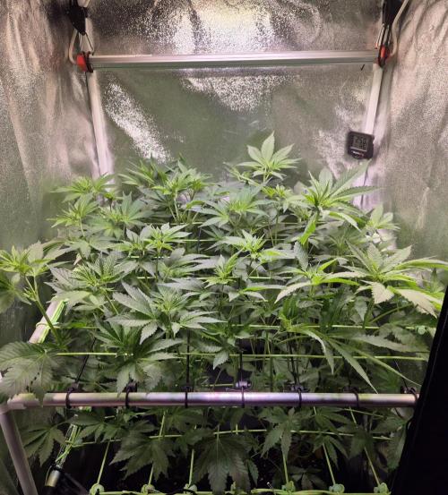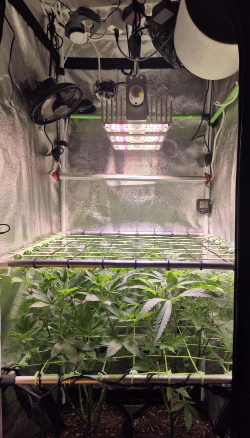 Daher wurden die Ladys nochmal getoppt um das Höhenwachstum der Haupttriebe etwas unter Kontrolle zu halten. So können alle kleineren Nebentriebe zum möglichst gleichmäßigen Blätterdach aufschließen. Den Rest macht der Stretch in der Blüte mit etwas LST.