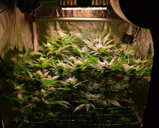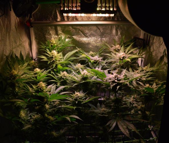In Woche 2 der Blüte wurde an Tag10 die Sanlight Q3W von 80%=96W auf 100%=120W hochgedimmt. Mit dem geringen Abstand der LED von nur noch 22-25cm bekommen die Ladys im Durchschnitt 900-1000ppfd.