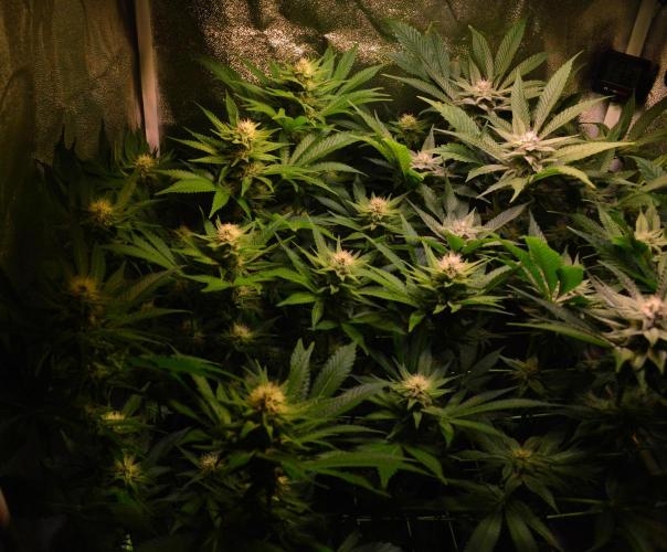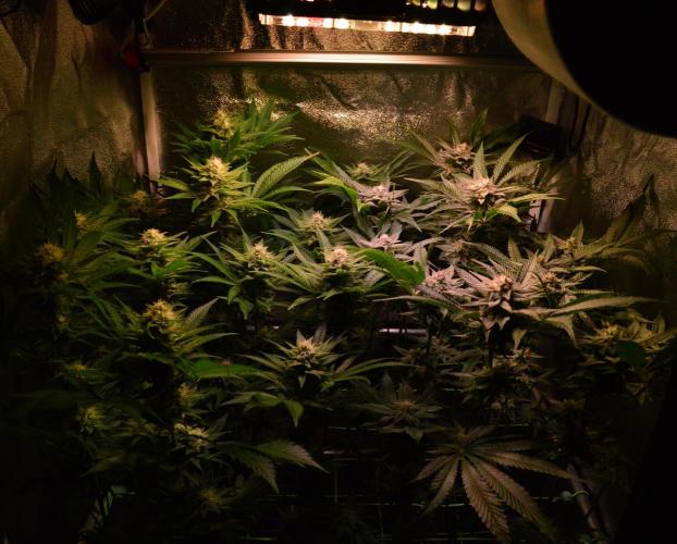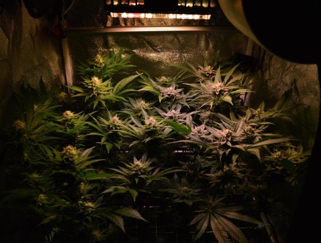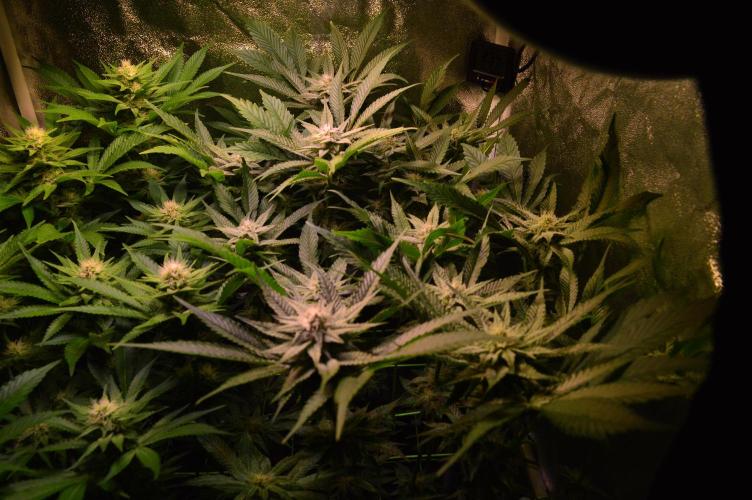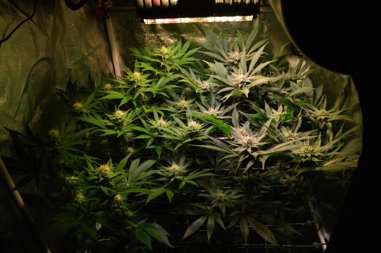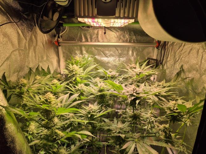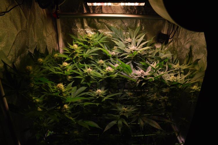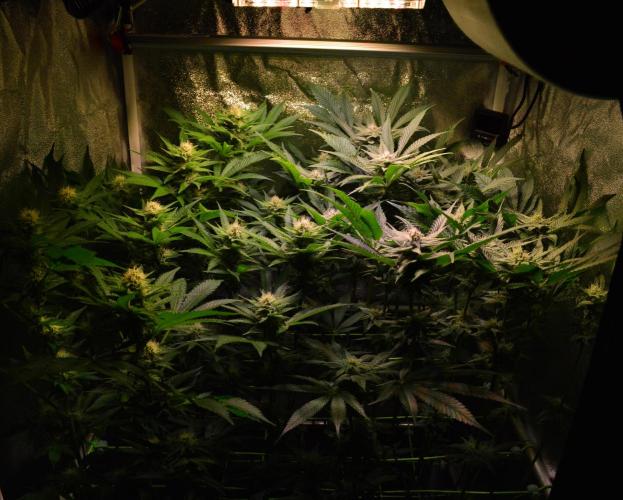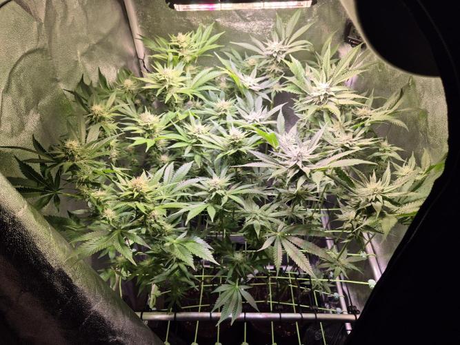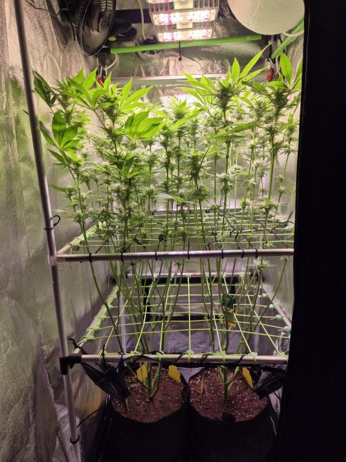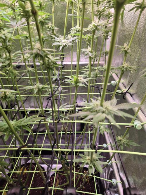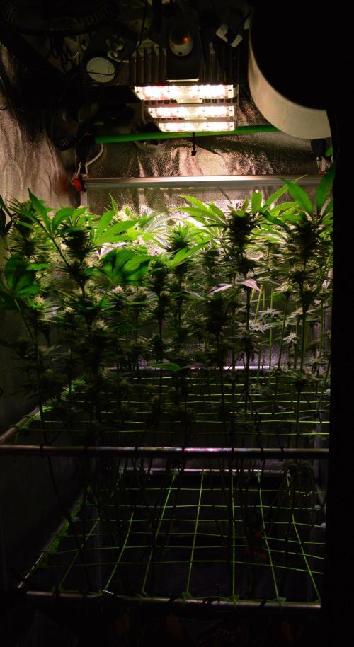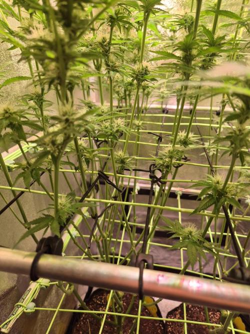 In Woche 4 der Blüte ist der Stretch deutlich abgeschlossen. Leider doch etwas spät. Einige Buds weisen schon Anzeichen von Bleaching auf. Ich hab schon zwei der längsten Triebe zum Rand gebunden, durch das wundervoll gleichmäßige Canopy sind alle Triebe fast auf der gleichen Höhe. Was mich sehr freut ist das die Lemonite und WCxBBC ziemlich gleich gewachsen sind. Zeigt sich das man das ganz gut eingeschätzt hat. Die WCxBBC entwickelt wie zu erwarten jetzt schon unverhältnismäßig viel Frost. So wie es aussieht entwickelt die Lemonite auch ordentlich fette Buds. Daher werden die Lemonite Stecklinge die grade wurzeln danach auf jeden Fall nochmal ins Rennen geschickt. Die Frage ist nur ob ich mit 2 Ladys in 12-15L Töpfen ins Rennen gehe oder mit 4 Ladys in 8L Töpfen um im Gegensatz zu 2 Ladys nochmal gut eine Woche Wachstum sparen und vielleicht auch etwas weniger wachstum zum Ende. Allerdings gestaltet sich die Pflege und das gießen in 60x60cm mit 2 Ladys weitaus entspannter. Die Hoffnung ist ja auch, das weil die Stecklinge etwas reifer sind und schon pre-flowers ansetzen werden, dadurch etwas schneller in die Blüte wechseln und der stretch minimal weniger ist. Im schlimmsten Falle haben einige Buds dann wieder bleaching. So wie die Lemonite produziert, kommt die danach auf jeden Fall nochmal ins Zelt. Danach wird es in dem kleineren Zelt wie schon letzte Woche erwähnt mit den Indica-lastigen Sorten weitergehen um diesen Höhenproblemen in dem 160cm Zelt aus dem Weg zu gehen.