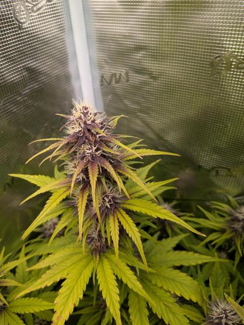 Flowers are clearly visible now, with one of the plants already showing a strong purple colour — very curious to see how this develops! 💜 However, the top-right plant is looking a bit limey, so I’ve ramped up the nutrients while keeping an eye on the runoff.