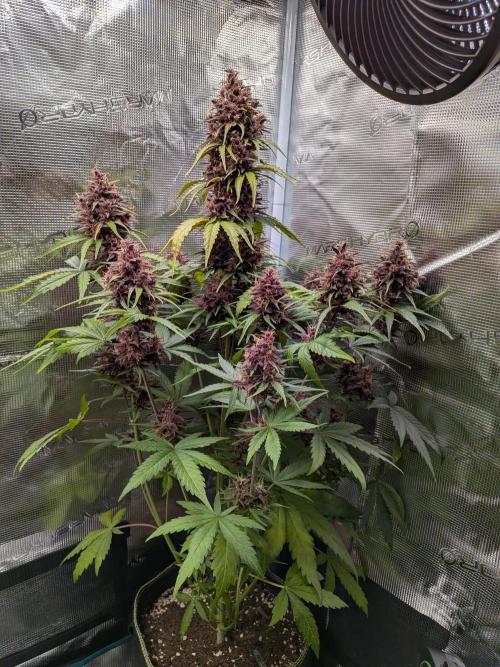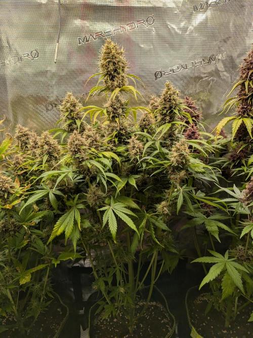 Flowers are clearly visible now, with one of the plants already showing a strong purple colour — very curious to see how this develops! 💜 However, the top-right plant is looking a bit limey, so I’ve ramped up the nutrients while keeping an eye on the runoff.