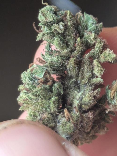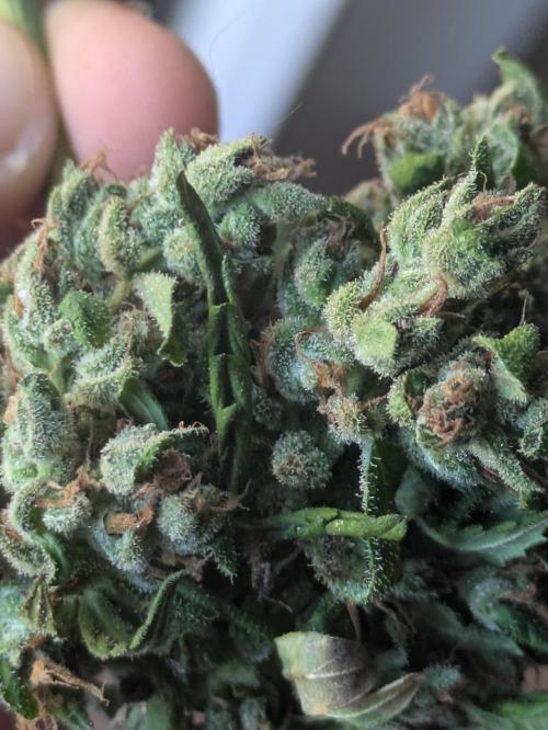 This one has small buds pretty dense but glistering in resin ,the top nugs are greasy at the touch leaving the fingers sticky and smelly