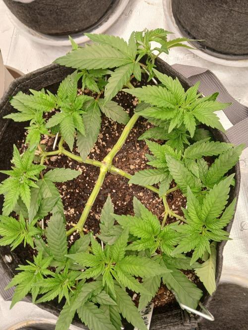 WHITE_sleeper She's about four and a half weeks old and I'm using garden staples to hold down the four mains I'm going to be starting with.. this is my 3rd grow and my first attempt at mainlining..