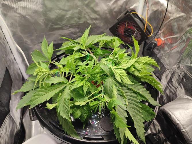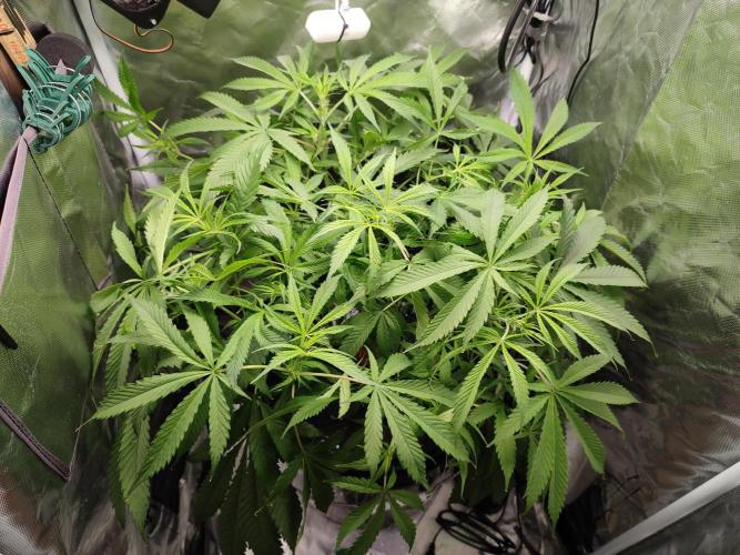 Germanator Added some low stress training after the top cut. She pushes back incredibly strong so I had to take away a lot of leaves. Will initiate flowering next week.