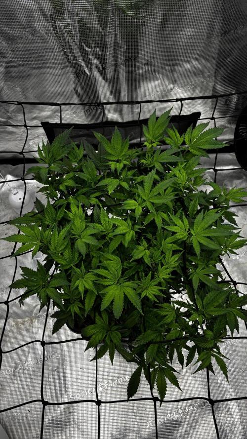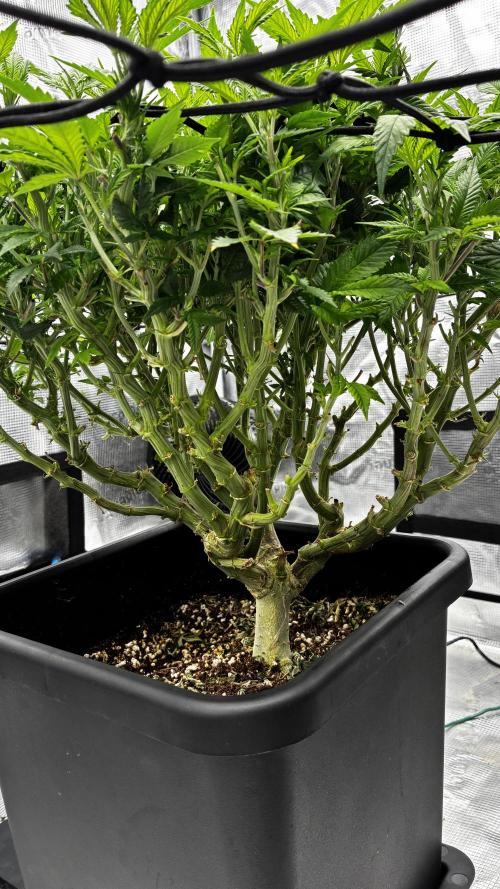FourTwenty_Plants A lot has happend in the last few weeks got to cut my autos so that the PM can go all on her own. Also instantly added a scrog net and started to defoliate her. Got about 5 more days in Veg then we will switch to 12/12, im hyped to see how she fills up the space.