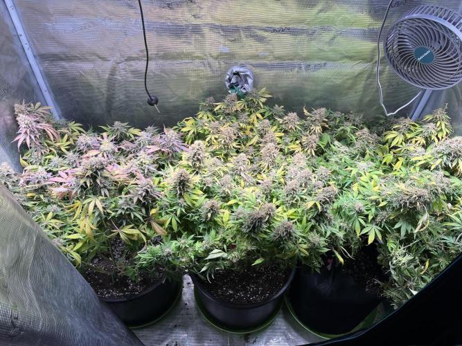 Lowbuds Back from holidays and everything is well, fat sticky buds, and still plenty to grow Yellowing under control after feeding Some purple showing on the « pump juice » pheno due to colder temperatures at night