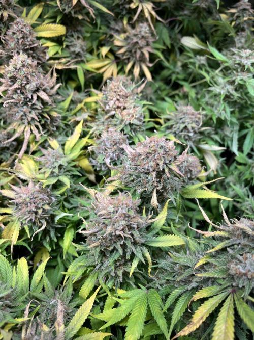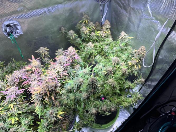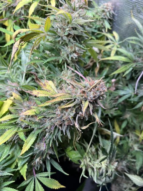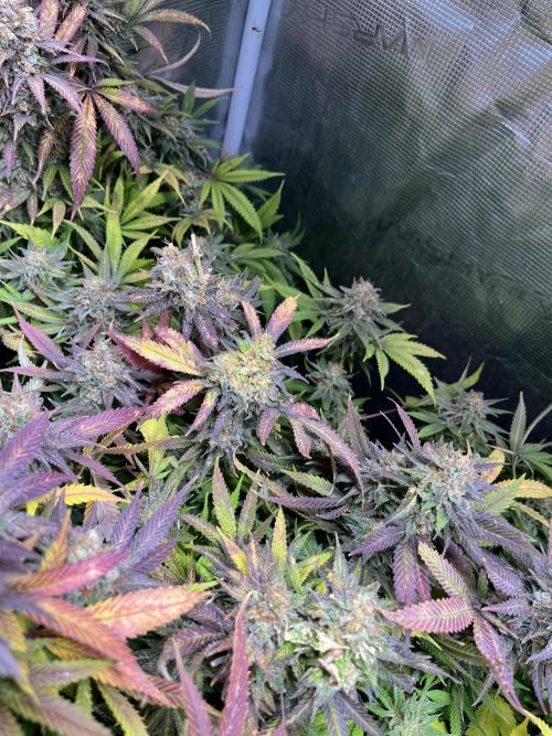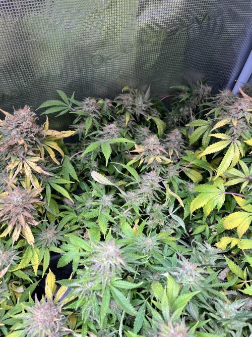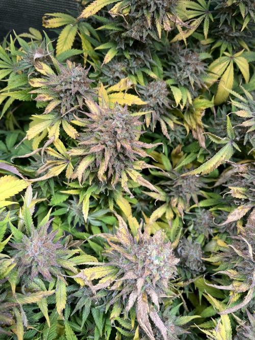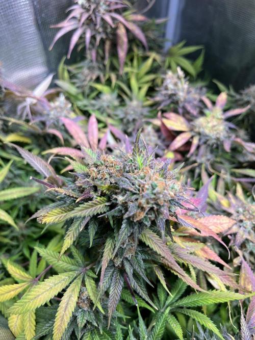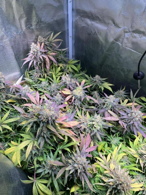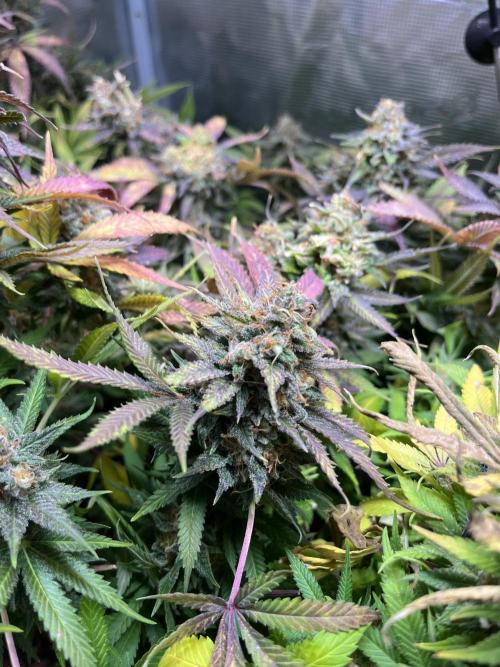 Lowbuds Buds getting bigger, still haven’t completely fixed that phosporus defficiency so still some yellowing. Temperature seriously dropped the last week and some purple color appear on the “pump juice” pheno. Thrips are totally gone, probably a mix a de larvae and colder weather. Smells really nice and citrusy, grapefruit vibe and a bit more funky / gassy on the “pump juice pheno” I should have lollipoped better as there as a lot of larfy growth under the canopy not getting any light or air on the “ghost nap” pheno