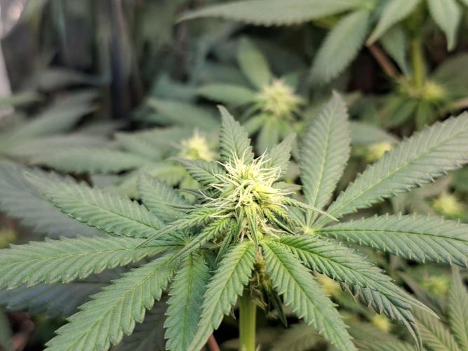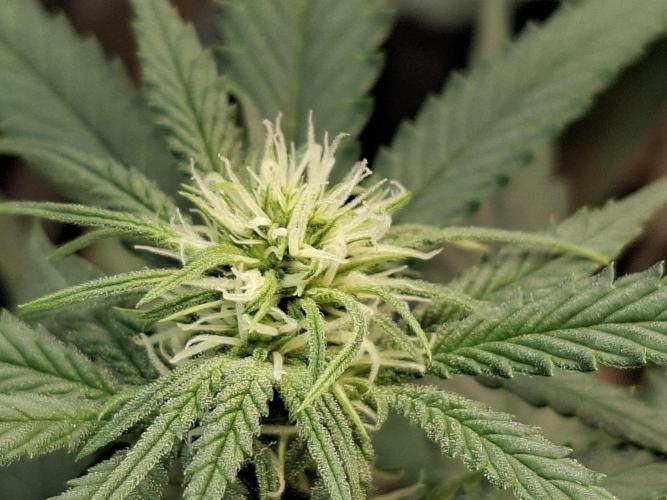 Remoção estratégica das folhas grandes de ventilador (fan leaves) para melhorar a circulação de ar, otimizar a distribuição de luz e estimular o desenvolvimento dos buds.
