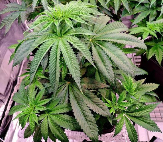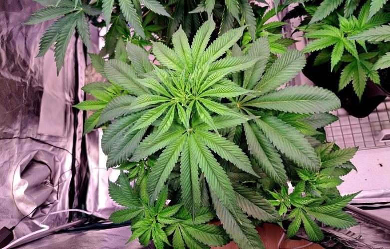 Hier und da werden große Blätter zwischen die Triebe gedrückt...morgen wird im Zelt etwas umgeräumt und sie erhält dann mehr Platz.