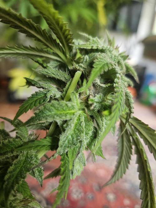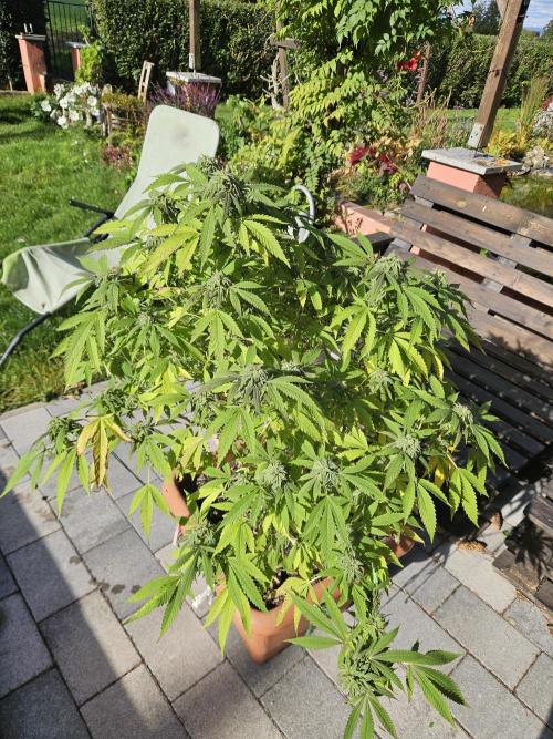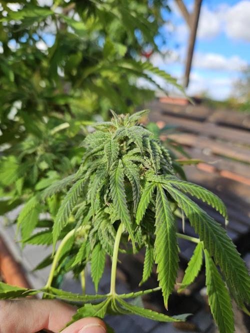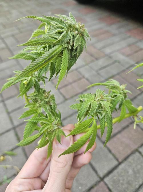 Mannirumpel420 Durch den schimmel an verschiedenen stellen an den Stielen,habe ich mich entschieden sie einfach zu ernten.Es macht einfach keinen Sinn mehr,da die Temperaturen schon die minusmarke geknackt hat.ihr Geruch hat etwas zitronenariges und ihre Blüten sind an manchen stellen äußerst Kompakt.