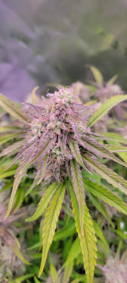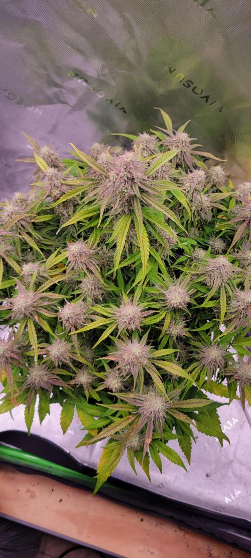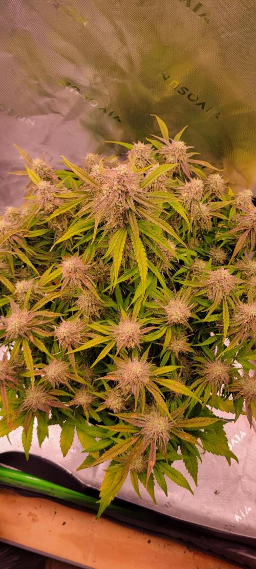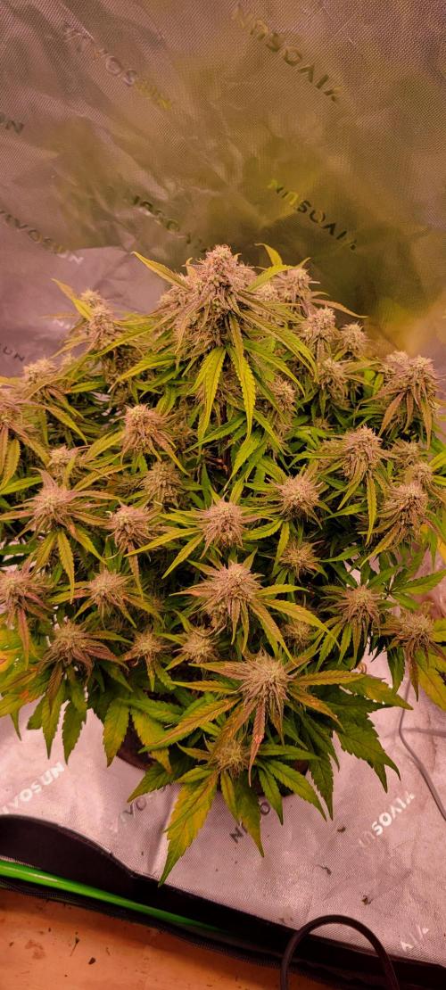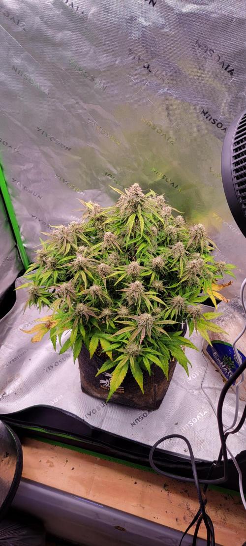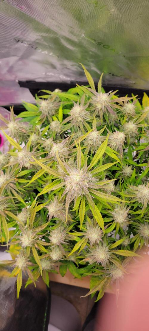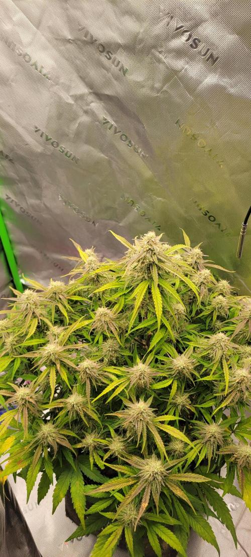 PavementPunk I gave her one last feeding and its been water since w some molasses 1 tsp per gal on occasion. Shes been filling out nicely and is the guinea pig for my new migro 250 L light been running on 80% about 19 inched from canopy because its quite warm. She should be getting harvested within the next week. The smell has gotten a bit stronger and is quite lovely like fruity candy