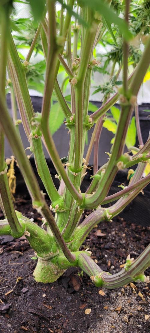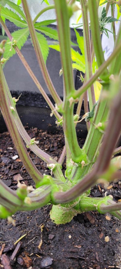 PavementPunk She got some yellowing and brown spots likely from too much bloom nutes possibly from high humidity and dense foliage. Defoliated got rid of a few runt branches half strength bloom feed with runoff and she seems better. I wonder if i should have only let the biggest branches bud but i guess we will see how they chunk up. More bloom food and weekly molasses 1to 2 tsp per gal of molasses. Gonna snip off a few more runt bud sites and get rid of a few more affected leaves and air/light blocking leaves. Happy growing friends