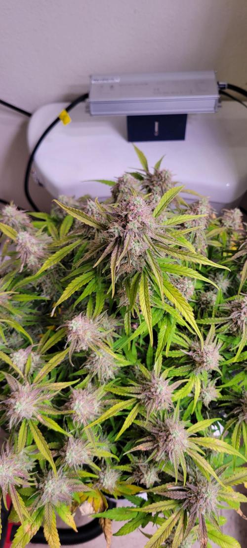 PavementPunk I gave her one last feeding and its been water since w some molasses 1 tsp per gal on occasion. Shes been filling out nicely and is the guinea pig for my new migro 250 L light been running on 80% about 19 inched from canopy because its quite warm. She should be getting harvested within the next week. The smell has gotten a bit stronger and is quite lovely like fruity candy