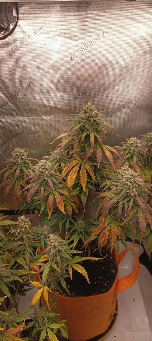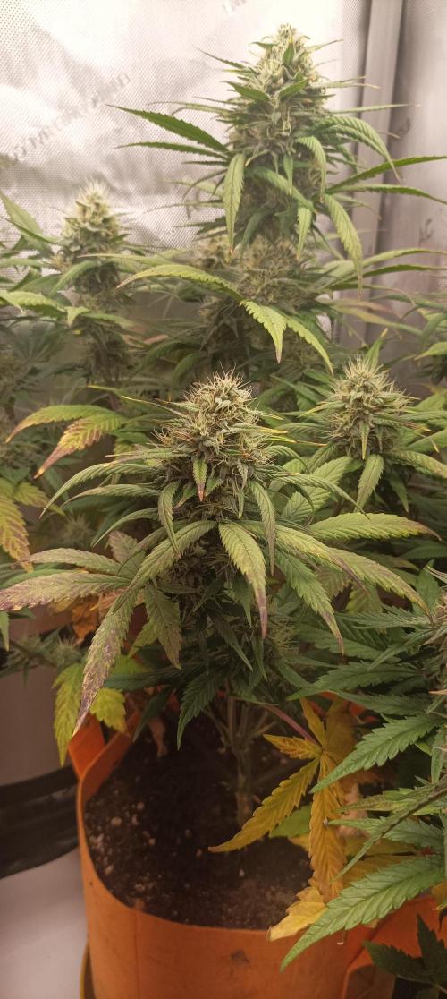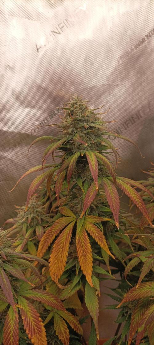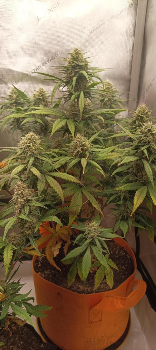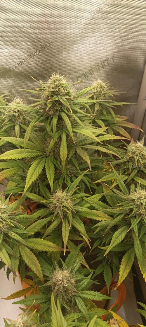 Hexahydrat666 Die Blütephase hat begonnen. Die Dame ist im Stretch, hat ihre Höhe innerhalb einer Woche verdoppelt und wächst trotzdem kompakt mit kurzen Abständen zwischen den Nodien. Trauermücken und Thripse scheinen (Nematoden und Raubmilben sei Dank) kein Problem mehr zu sein. Die Beleuchtung läuft im Blütemodus bei ca. 120Watt.