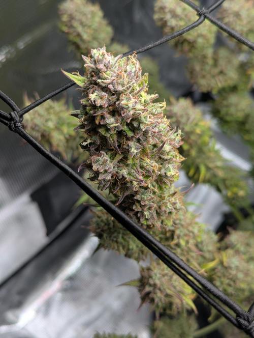 Light feeder but great yielder! Buds so thick they had to be supported with a trellis net. During the latter part of flowering, perhaps due to lower temperatures, this pheno expressed some pink and purple. Terpenes are amazing and bud density is okay.