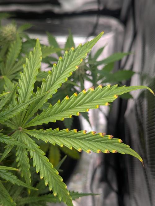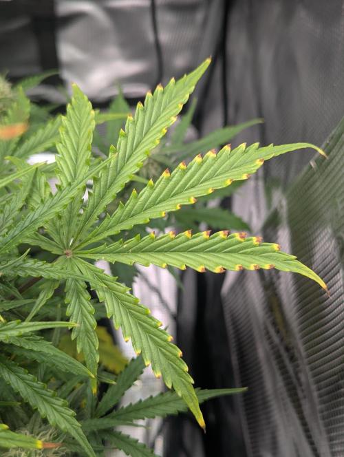As for her health. I'm discovering more and more leaves with obvious damage. Most of the damage can be related to either redistribution or Nitrogen - the lower leaves that weren't catching direct light, or nute burn. What's curious, is that most of the damage is on leaves that I pinched to move the out of the way earlier. Also during the fan set-up, I removed the NLA from the tent to work, and noticed that outside of the tent, away from the LED panel, her upper growth actually looks fine and lush green. So, I'm not too worried about her health detoriating anytime soon.