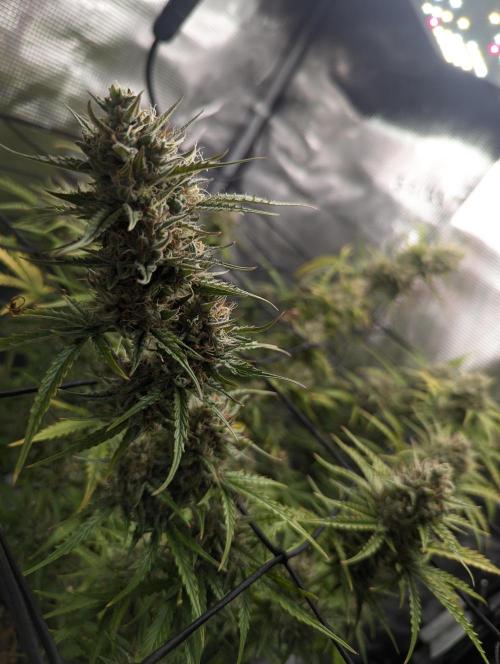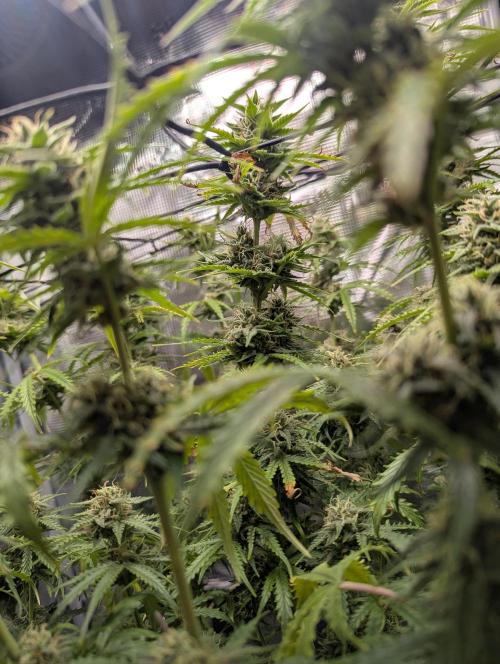 She's definitely well on her way to stretch, and some of the bud sites are already showing signs of consolidation and an increase of mass, not so much as to call it stacking or bulking, but a great early flower nonetheless.