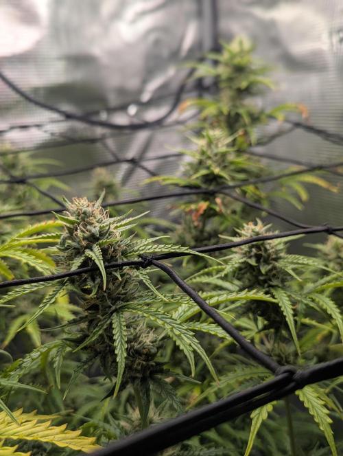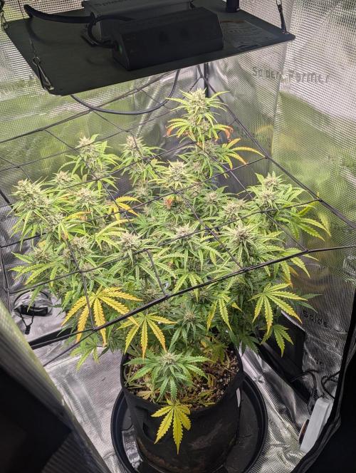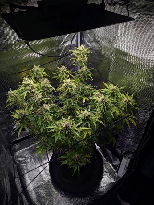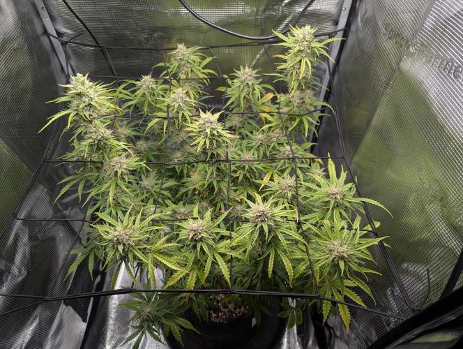 Compared to my last grow (Sherbet Queen), where topping led to four main branches and a constant struggle to keep the lower nodes on par with the uppers — eventually resulting in four dominant colas above a cluttered lower canopy — this grow is already showing more even development. All the smaller apexes are keeping pace with the top, giving me confidence that this canopy will grow much more uniformly. I’ll still try to keep the main stem in check, but overall this approach feels more balanced.