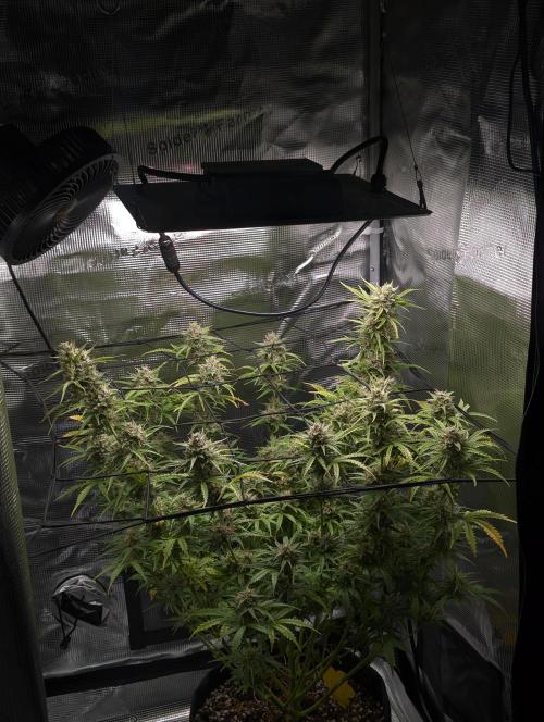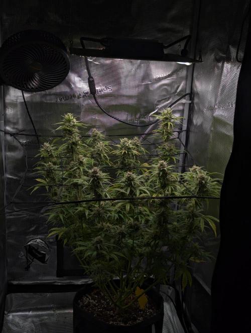 She's grown as far as to again almost touch the LED panel - her highest budsite catching about 1150 PPFD. With the incline fan combination now on top of the tent, I could raise the LED panel to lower that number to about 800PPFD, and between 400-700 PPFD for the canopy.