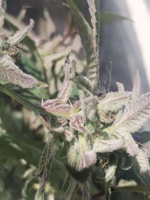 You can tell she’s pushing through with that sweet tart candy aroma still filling the air, a sure sign she’s back on track. Trichomes are mostly cloudy now, and she’s inching closer to her final ripening phase.