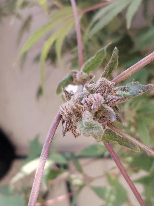 She’s holding her color beautifully, rocking those purple-striped stems like it’s fashion week. Side branches are flexing too, each one proudly carrying their own little crown of future frost.