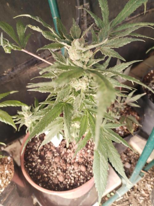 Airflow in the greenhouse is good, with plenty of space between plants to keep humidity in check. No signs of pests or stress so far — just happy Bluecheese settling into flower mode.