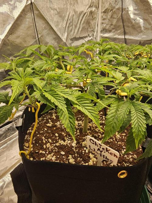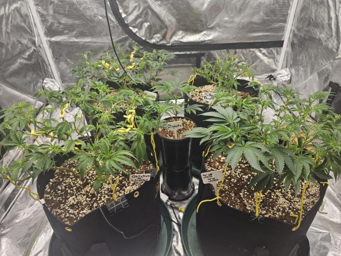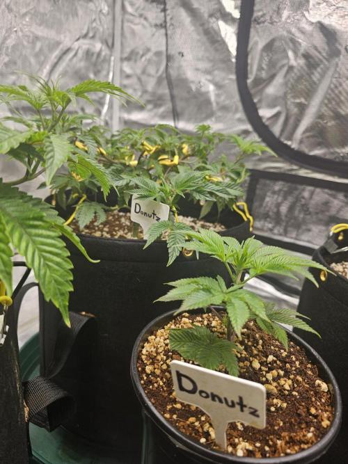 Ohunt1776 Topped all girlies to 5in. Tops kept as clones but only Chicken N Waffles and Donutz had an actual stems. (3 small clones died so far out of both grows.) A few days later, we cut off most of their big fan leaves not attached to nodes. Gave foliage spray of flora+ and calmag ph = 6.0 - they look hungry but we are waiting for new tent until transplanting. At the end of w7: Transplanted babies into 7gal (25%perlite/75%coco) fabric pots that were presoaked in Calmag RO water and given microrizi. Moved into 5x5 Gorilla tent, 450 ppfd, and given a medium strength half gallon nutrient feeding. Top nodes facing handles. Plants were sprayed with the same foliage spray used earlier this week - top and bottom of leaves and at base of stem. Notes: Jedi Juice has mix matching corresponding number leaves.