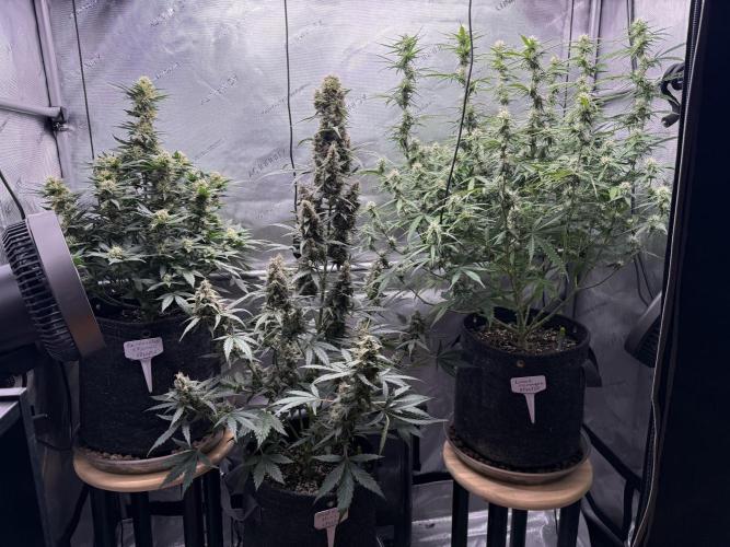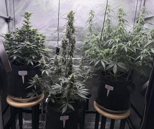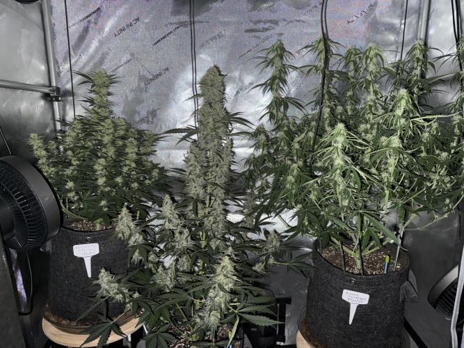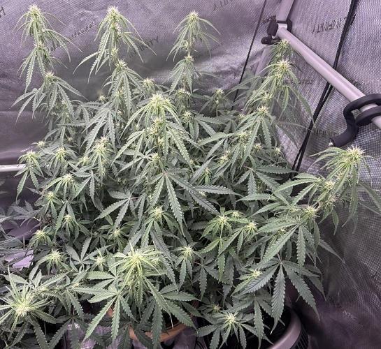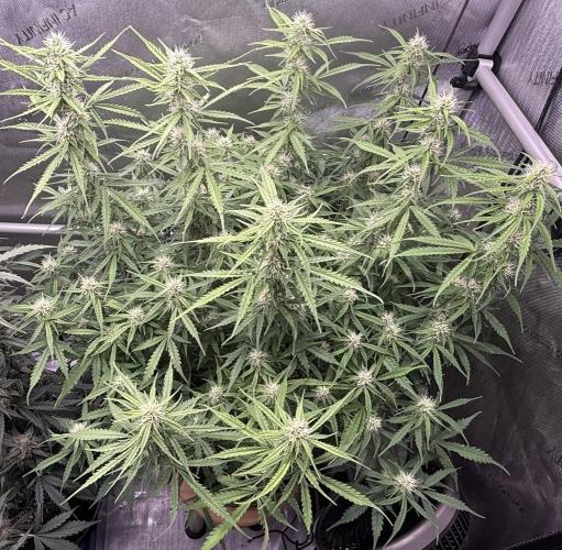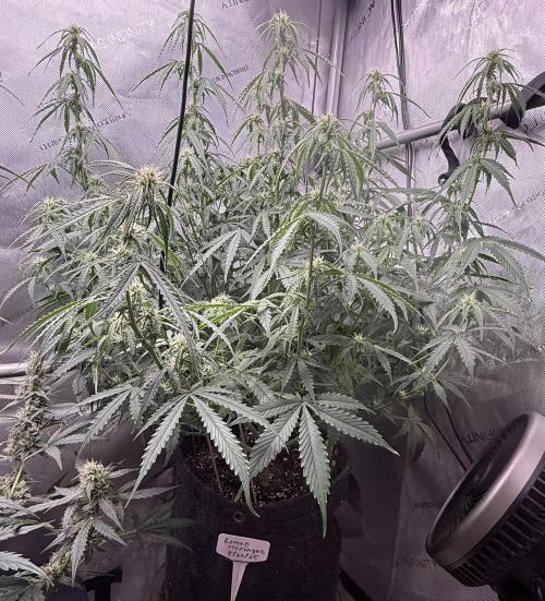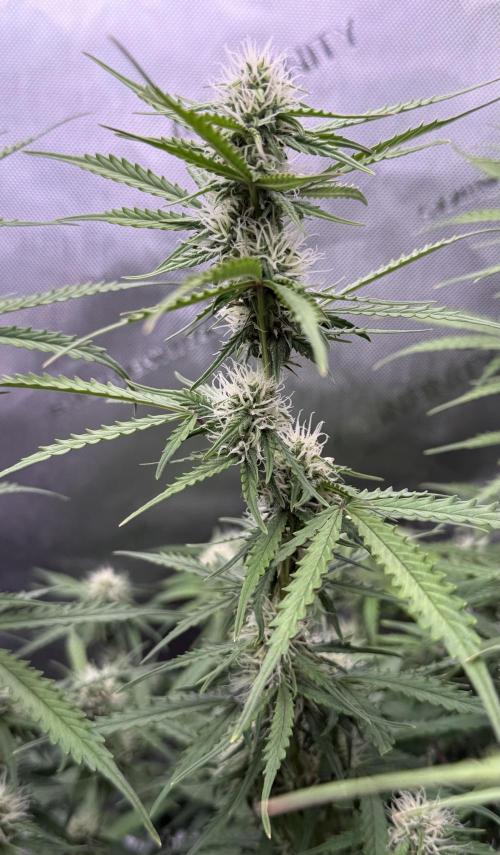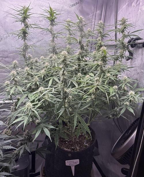 Frambo2V4T Day 50 - fed them .5gal water Day 53 - fed them .5gal CES nutrients, buds are starting to pack on Day 54 - raised the light 2”, afraid of light/heat stress, starting to get a nice lemon smell, the estimated grow time I found for this was 56days total, this is looking like a 80-85 day plant.