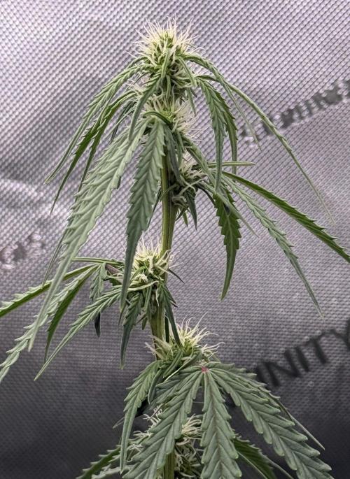 Frambo2V4T Day 44 - fed them .5gal CES nutrients Day 46 - fed them .5gal water, leaves are really skinny, like a sativa. Strain info says 60% Indica & 40% sativa, also suggests roughly 56 day harvest time, no way for this girl. Day 48 - 24”, fed them .5gal CES nutrients Day 49 - defoliated.