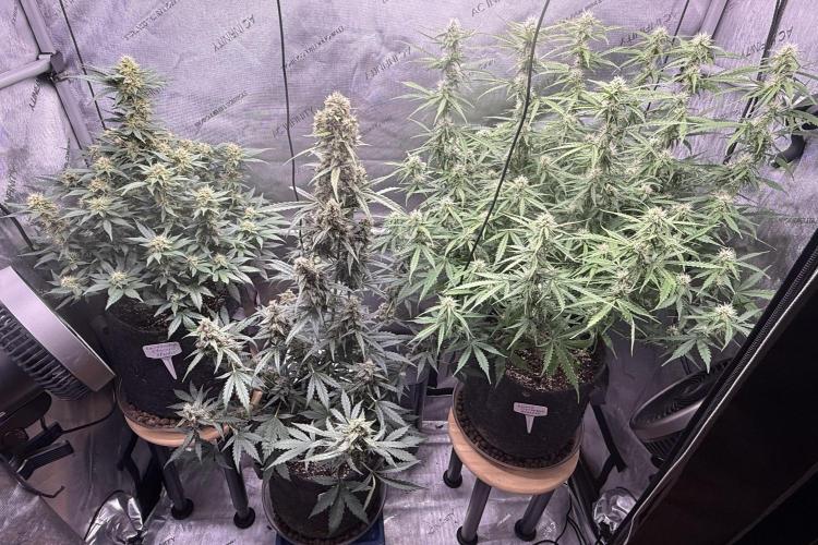 Frambo2V4T Day 36 - 13.5”, fed them CES nutrients, turned lights to 100% / 25%, defoliated. Day 38 - fed the .5gal water. Day 40 - 19”, fed them CES nutrients, turned lights to 100% / 50%. Day 42 - fed them .5gal water, defoliated to open up the canopy to get light in.