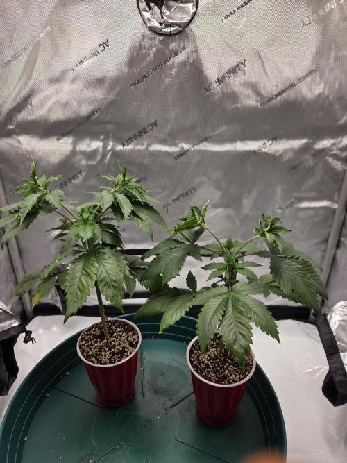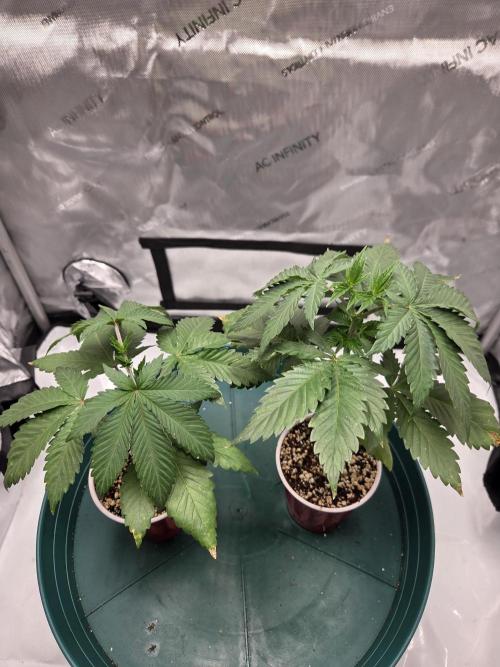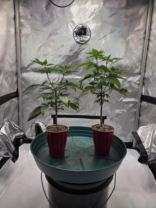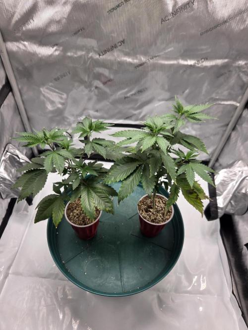 ao_grows1978 2nd week down and Mystery Made 2 is cruising along. Topped off the cups with a little more coco to stabilize the girls at the base. They're drinking about 4oz of water every other day and should have access to nitrogen from the Grow Dots. They'll be getting a topping this coming week to maximize the amount of tops I get from these solos. Lights are still at 30% and looks like their early stretch has been managed. Theres a bit of variagation on one of the plants, but doesn't look like a deficiency. On to week 3 😁
