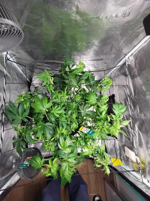 This week the approach was still to slow growth until there’s room in the tent. But hopefully in 1–2 weeks the neighboring plant will be harvested, so it won’t be long. Overall I’ve now topped the plant at the main stem and the four largest side shoots, and at the end of the week it will be moved into its final pot.