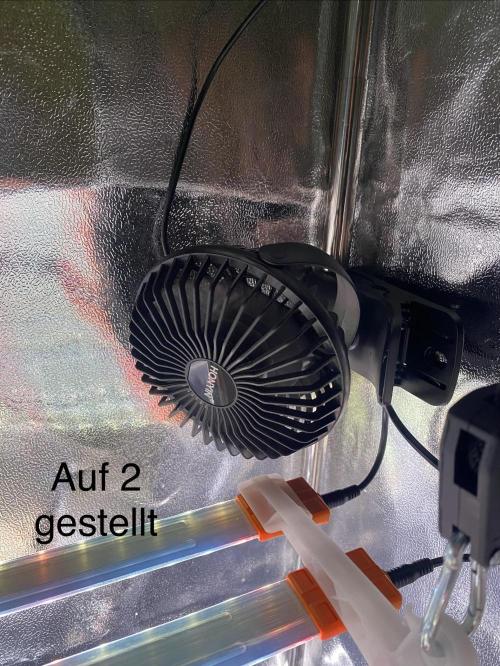 Ventilator (https://amzn.eu/d/8BfzB8K): Stufe 1, weht leicht über den Sämling für starke Wurzeln