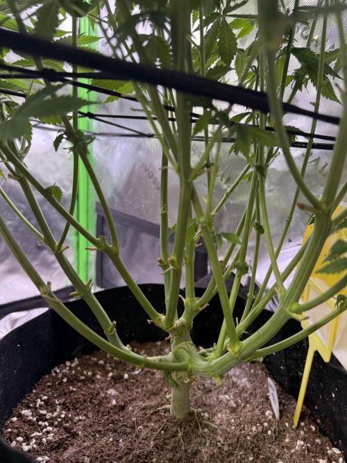 FarmerRasa Started training the plant. Trying to spread out the branches so they all are level and evenly getting light. Going to need to do some defoliation in the next week. Really happy with how this is turning out. Growing well and looking very healthy. Green in the leaves has darkened well too after giving the tea to fix the N deficiency.