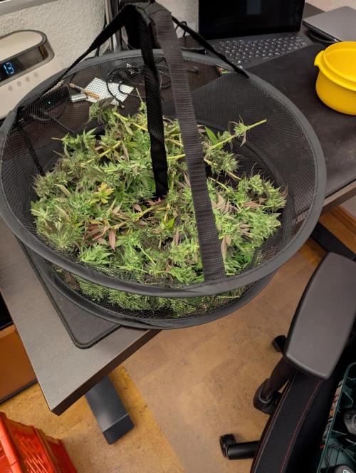 Theo_Rehtisch PS: GMO-Ernte lag gefühlt doch etwas zu dicht & zu sehr geschichtet im Trocknungs-Netz, daher diese Ernte (ebenso wie die Special Kush) so weit möglich aufgehängt. Übrige einzelne Buds auf Küchen-Sieben einlagig ausgebreitet, so sollte die Trockung besser klappen. Wird jetzt alles (geplant) für eine Woche verschlossen gelassen, dann nächster Check.