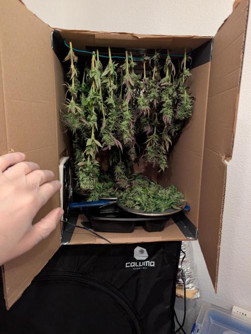 -Test beider Boxen (leer) als geschlossenes System inkl. Grow-Zelt (eine Pflanze darin in Blütewoche 5) ergab ca. 24°C/70% rel. Luftfeuchte, kommt also für Trocknung unter keinen Umständen in Frage