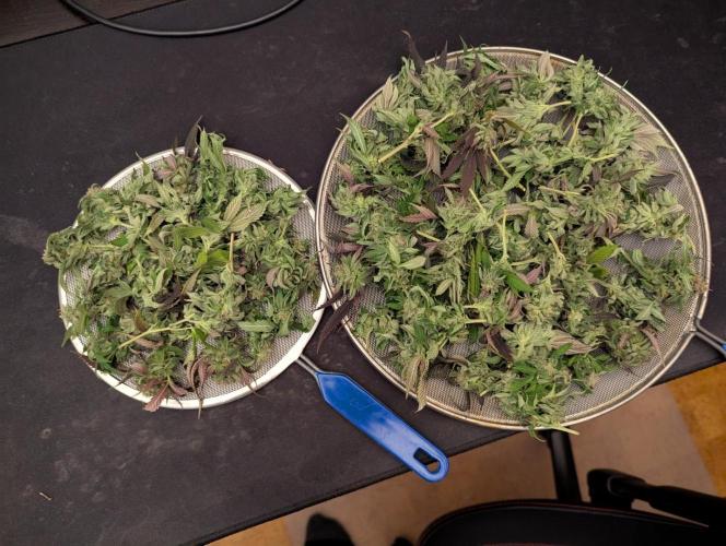 -die 2. Kush wird evtl. auch Ertrag liefern aufgrund der schieren Größe & Pflanzenmasse, aber das wet- und dry-trimming wird absehbar kein Spaß...