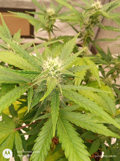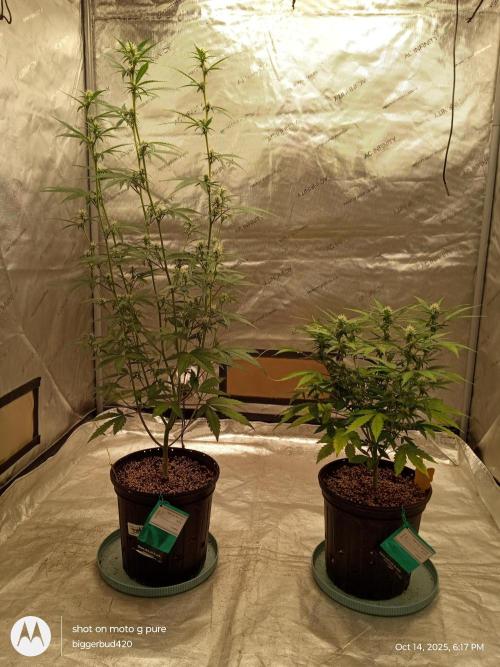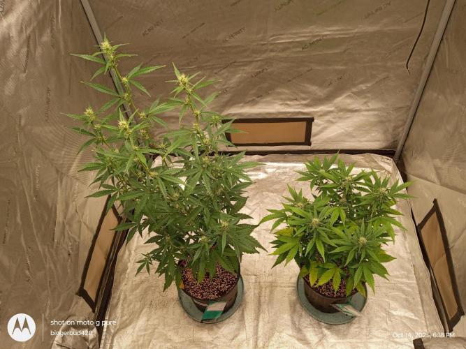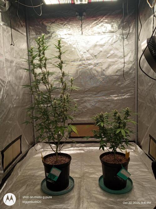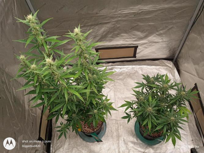 biggerbud420 plants are coming along one is 38 inches and the other is 16 talking about twins lol the taller one has slim airy buds but the shorter one has thick dense buds