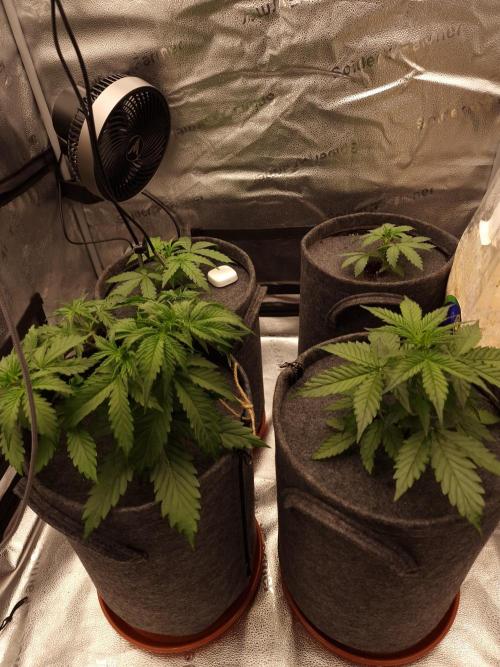 Two of them are looking strong and healthy, with nice green leaves, while one is a bit smaller and slower. They all went straight into 15 L fabric pots with a light soil/coco/perlite mix.