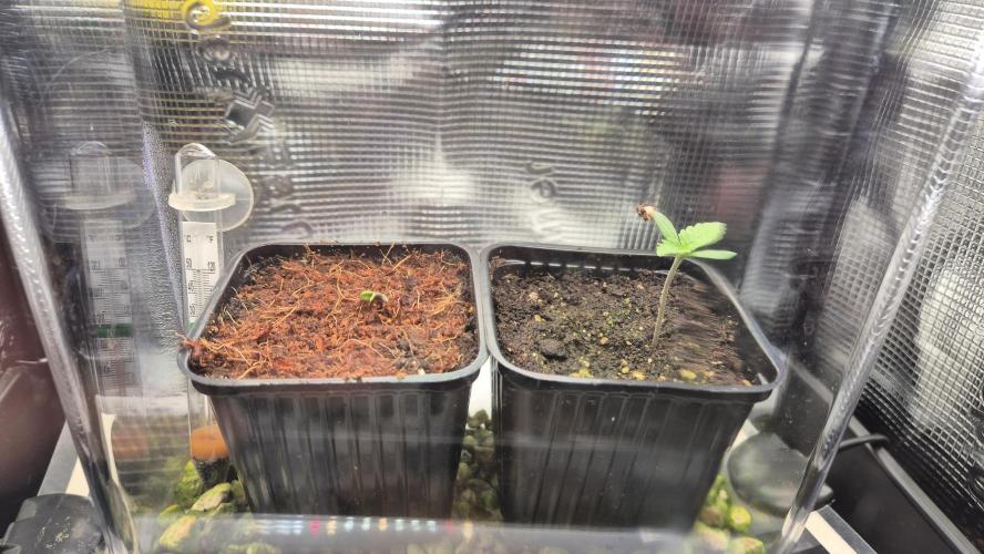 * Tag 0.5: So langsam sollte sich was tun. Vorsichtig öffnen wir den Easy Plug. Die wurzel ist ausgebildet aber scheinbar steckt der Keimling in der Schale im Plugfest. Wir topfen in Kokoserde um