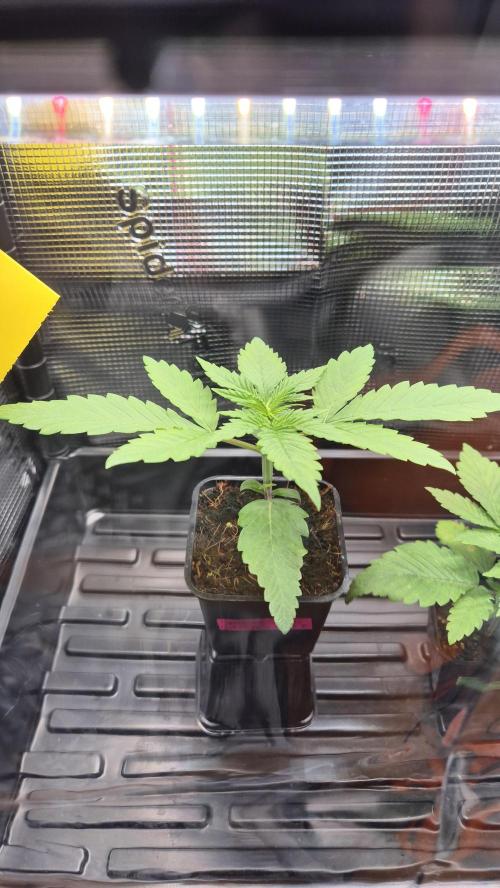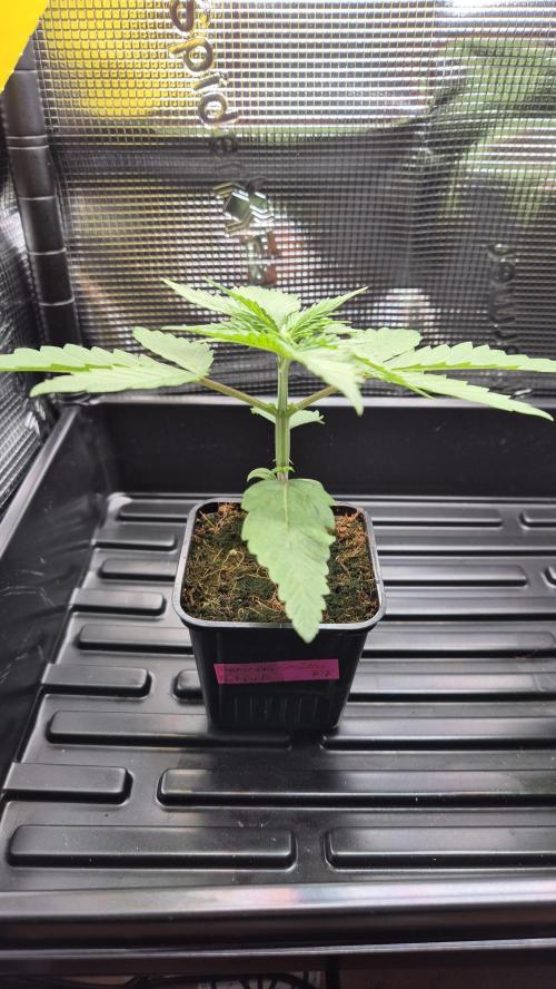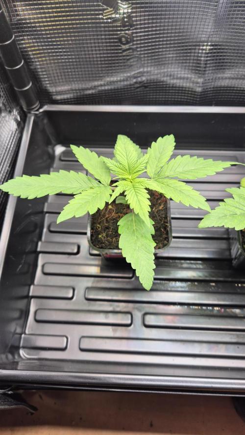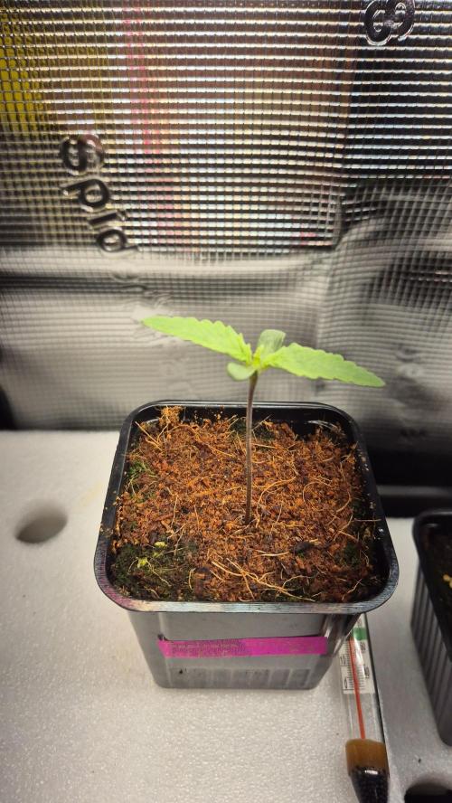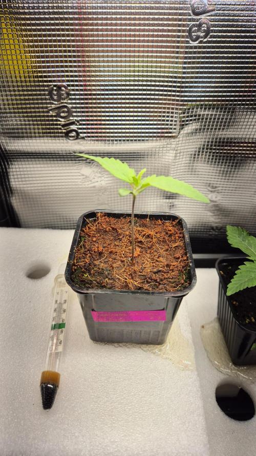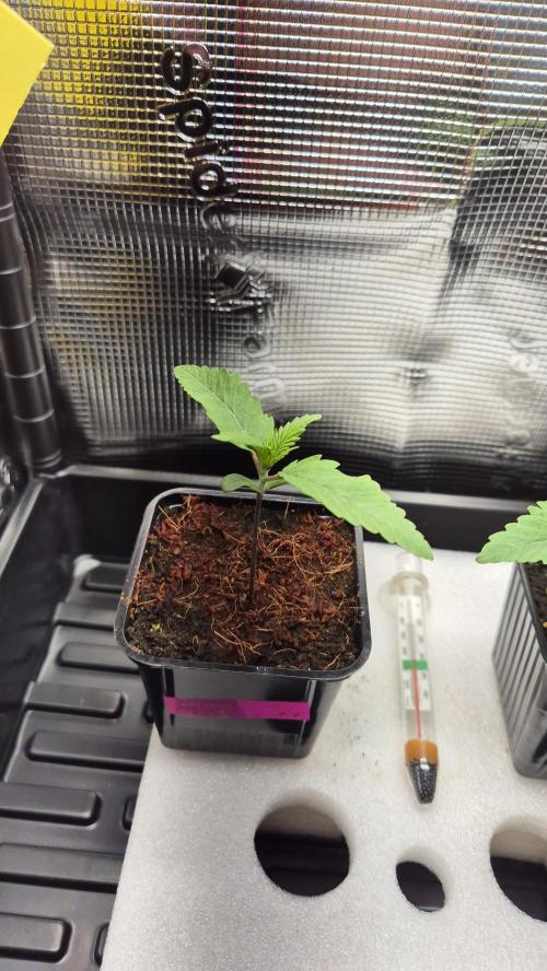 Die DlI steigern wir bis zum Ende der Woche auf 30. Die ersten echten Blätter sind bereits gewachsen, sobald das Substrat das erstemal zu trocknen beginnt, gibt es das erste mal Wasser mit 2ml/l Calmag und 2,5ml/l Hesi Root sowie ggf. 2ml Hesi TNT bis die Erde wieder ausreichend feucht ist.