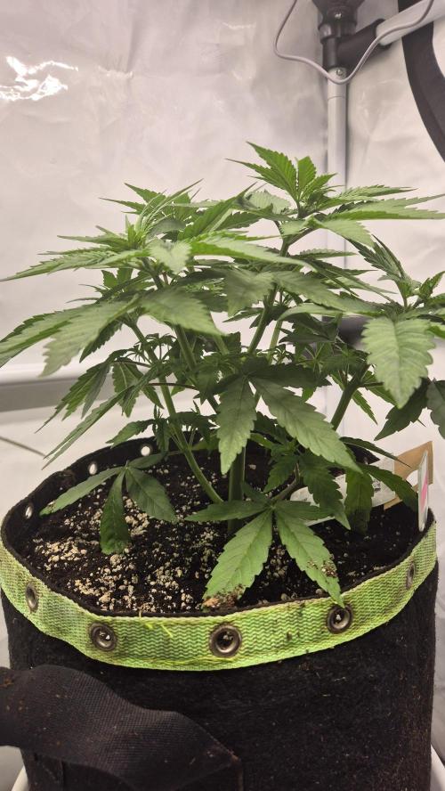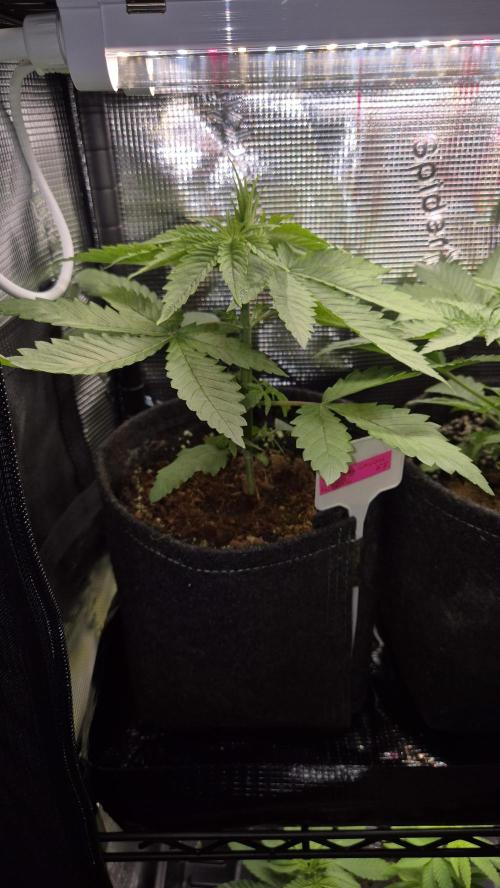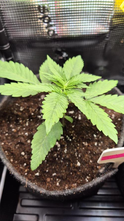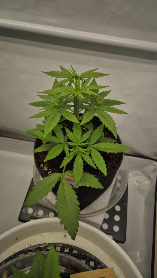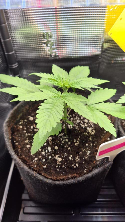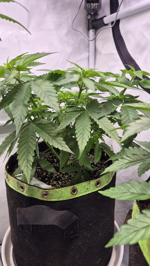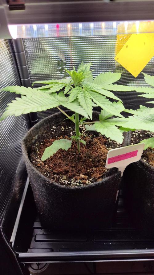 Die Kekse sind jetzt in der 3 Lebenswoche. Die ersten echten Blätter sind gut gebildet und die Pflanze ist gesund gewachsen mittlerweile hat sie 2 Nodien. Noch ist sie nicht über ihren Topf hinausgewachsen und bis zum ersten umtopfen in den 3l Stofftopfkann noch gewartet werden. AN Tag 14 wurde es dann aber auch Zeit, da das Blümchen einen kräftigen Schub gemacht hat. Diese Woche gibt es zum ersten Mal die standart Düngedosis, angepasst an das Pflanzenbild 2,5 -5ml Hesi TNT für ordentlich Nährstoffe im Wachstum, 5 ml/l Hesi Root für eine kräftige Wurzelentwicklung und 2 ml/l Calmag, um unser Osmosewasser aufzuhärten. Der DLI wurde auf im Laufe der Woche auf 40 erhöht.