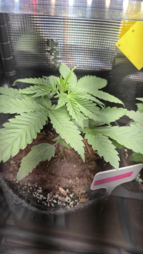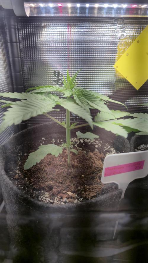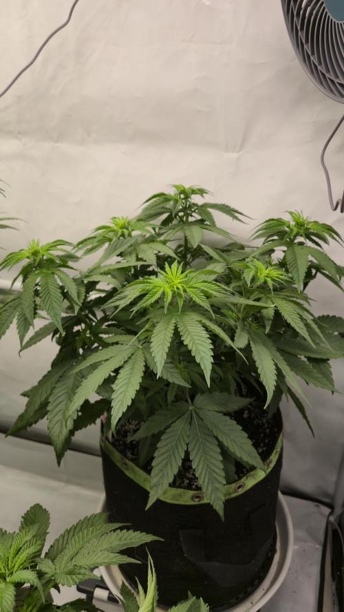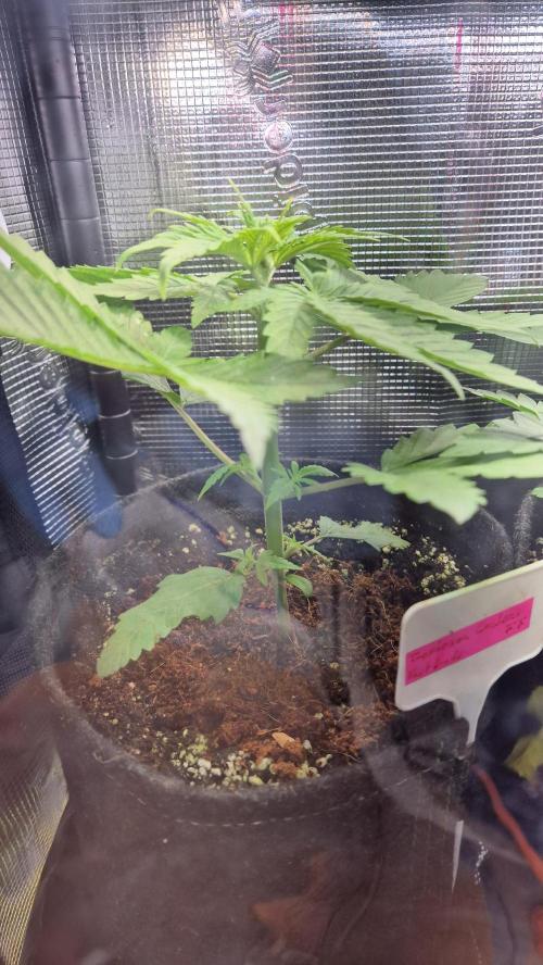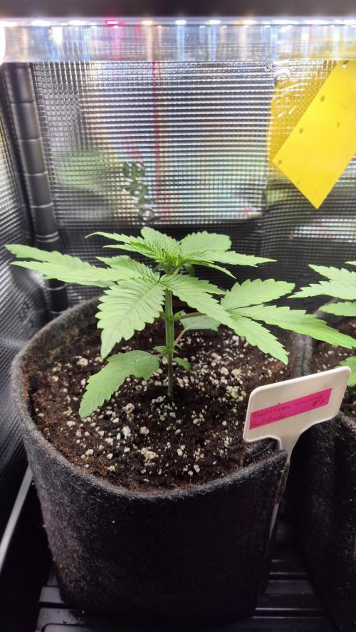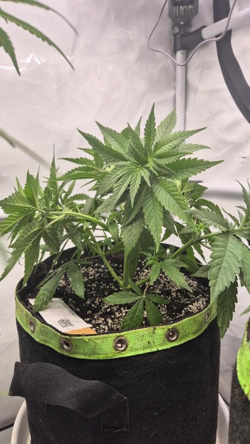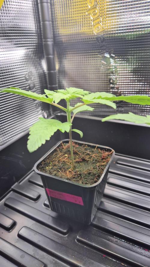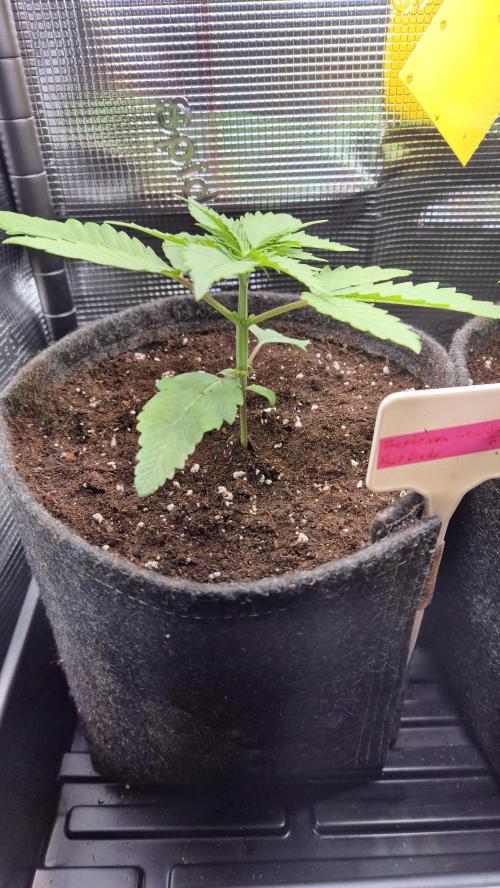 Die Kekse sind jetzt in der 3 Lebenswoche. Die ersten echten Blätter sind gut gebildet und die Pflanze ist gesund gewachsen mittlerweile hat sie 2 Nodien. Noch ist sie nicht über ihren Topf hinausgewachsen und bis zum ersten umtopfen in den 3l Stofftopfkann noch gewartet werden. AN Tag 14 wurde es dann aber auch Zeit, da das Blümchen einen kräftigen Schub gemacht hat. Diese Woche gibt es zum ersten Mal die standart Düngedosis, angepasst an das Pflanzenbild 2,5 -5ml Hesi TNT für ordentlich Nährstoffe im Wachstum, 5 ml/l Hesi Root für eine kräftige Wurzelentwicklung und 2 ml/l Calmag, um unser Osmosewasser aufzuhärten. Der DLI wurde auf im Laufe der Woche auf 40 erhöht.