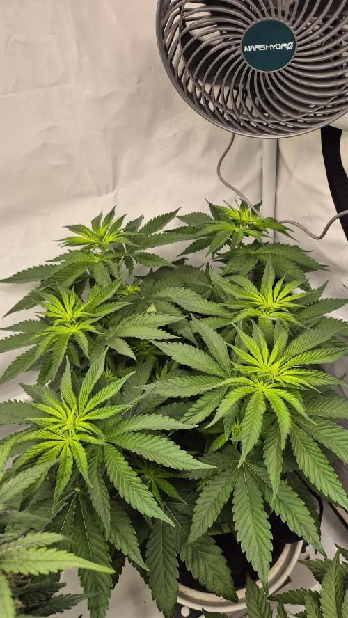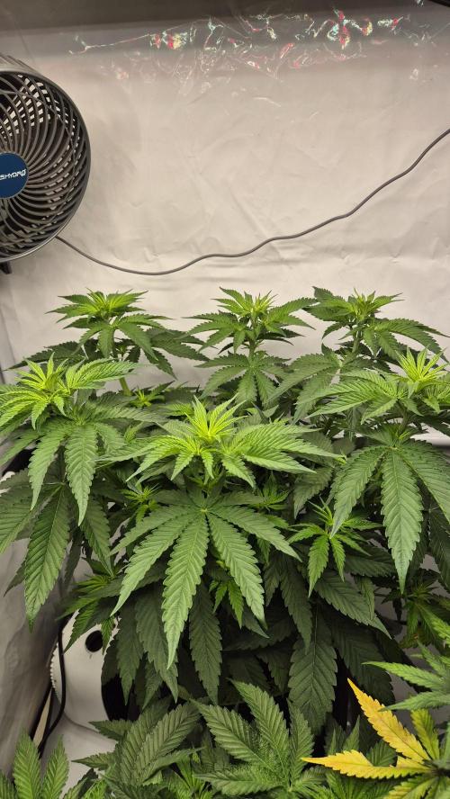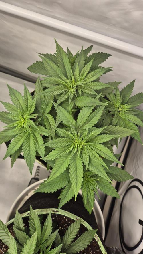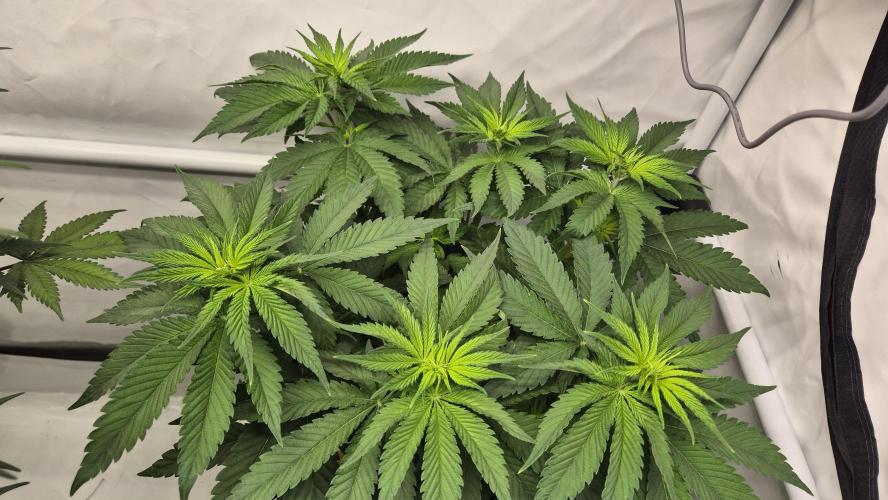 Das große Ereignis steht bevor! Der Lichtzyklus wurde vor 4 Tagen auf 12/12 umgestellt. Um den Übergang stressfrei zu gestalten, haben wir das DLI auf 30 reduziert. Der Düngeplan wechselt auf 4 ml/l Hesi Bloom, 2 ml/l Hesi Boost (einmal wöchentlich), 1 ml/l Plagron Greensensation (einmal wöchentlich) und 2 ml/l Calmag.