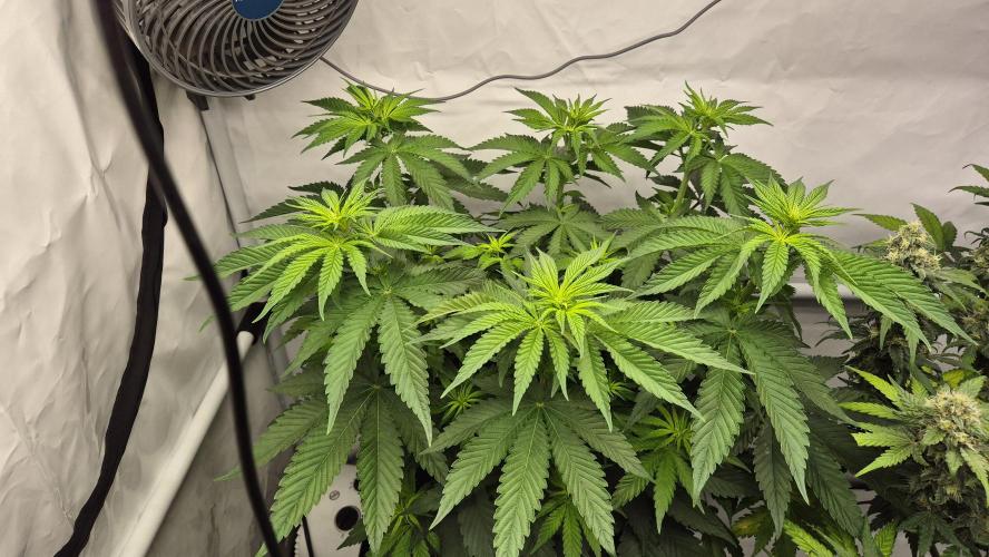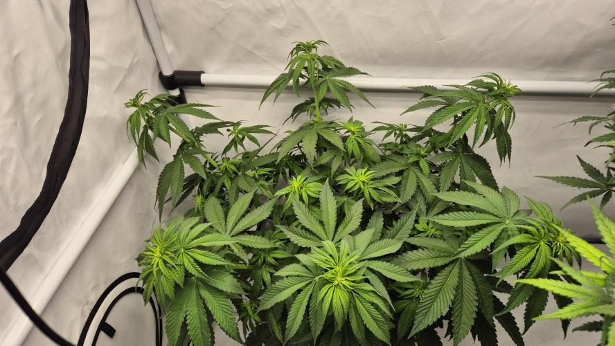Das große Ereignis steht bevor! Der Lichtzyklus wurde vor 4 Tagen auf 12/12 umgestellt. Um den Übergang stressfrei zu gestalten, haben wir das DLI auf 30 reduziert. Der Düngeplan wechselt auf 4 ml/l Hesi Bloom, 2 ml/l Hesi Boost (einmal wöchentlich), 1 ml/l Plagron Greensensation (einmal wöchentlich) und 2 ml/l Calmag.